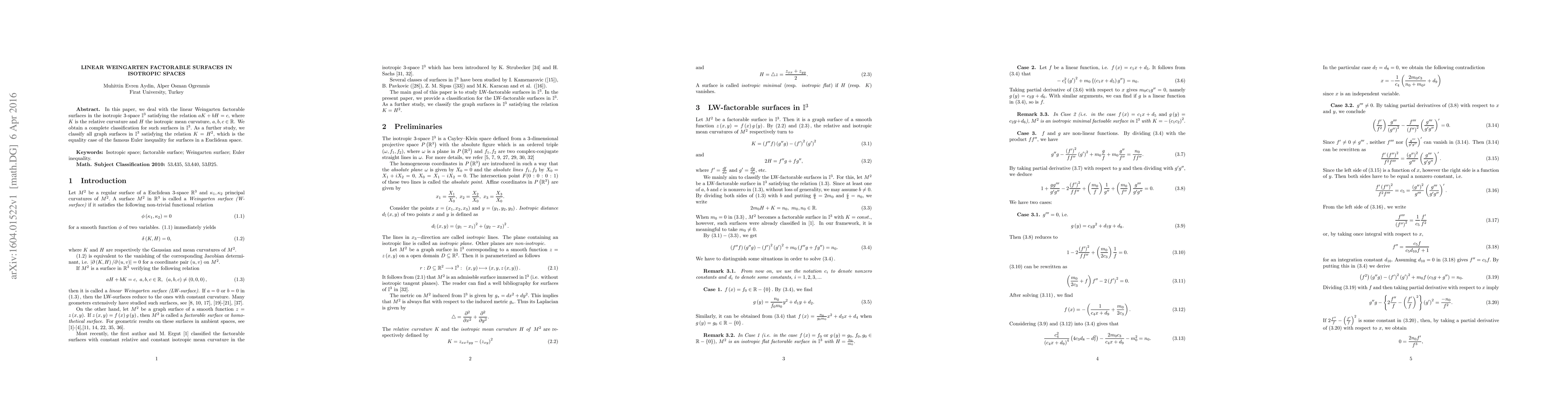 This paper classifies linear Weingarten factorable surfaces in isotropic 3-space that satisfy aK + bH = c, where K is the relative curvature, H is the mean curvature, and a, b, c are real numbers. It also studies and classifies graph surfaces in isotropic 3-space that meet the relation K = H², the equality case of Euler’s inequality for Euclidean surfaces.