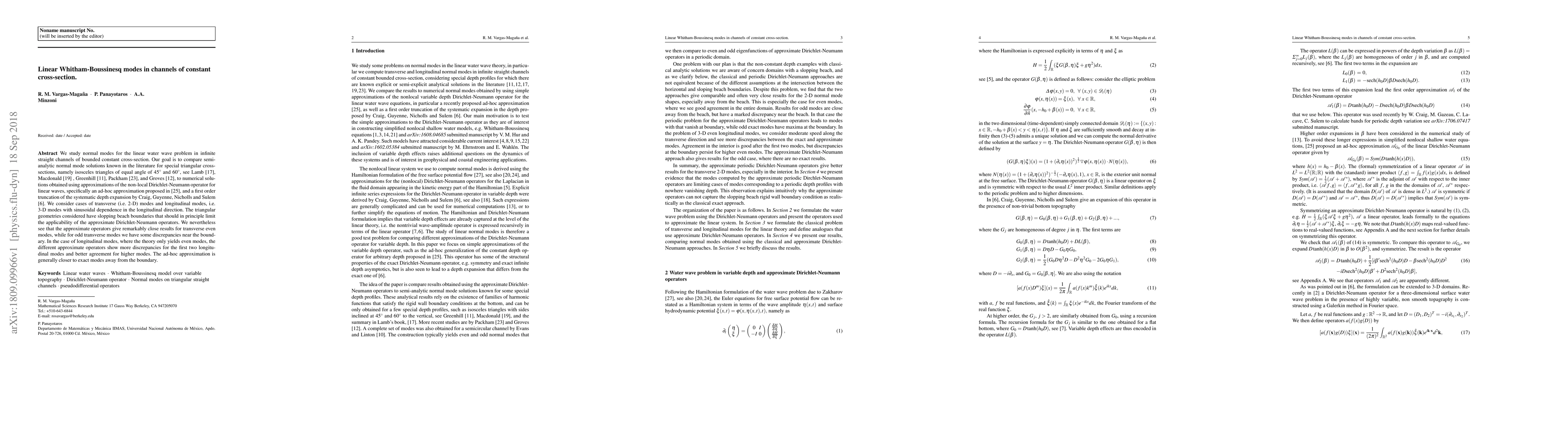 This study compares semianalytic normal mode solutions for linear water waves in straight channels of constant cross-section to numerical solutions using approximations of the non-local Dirichlet-Neumann operator.