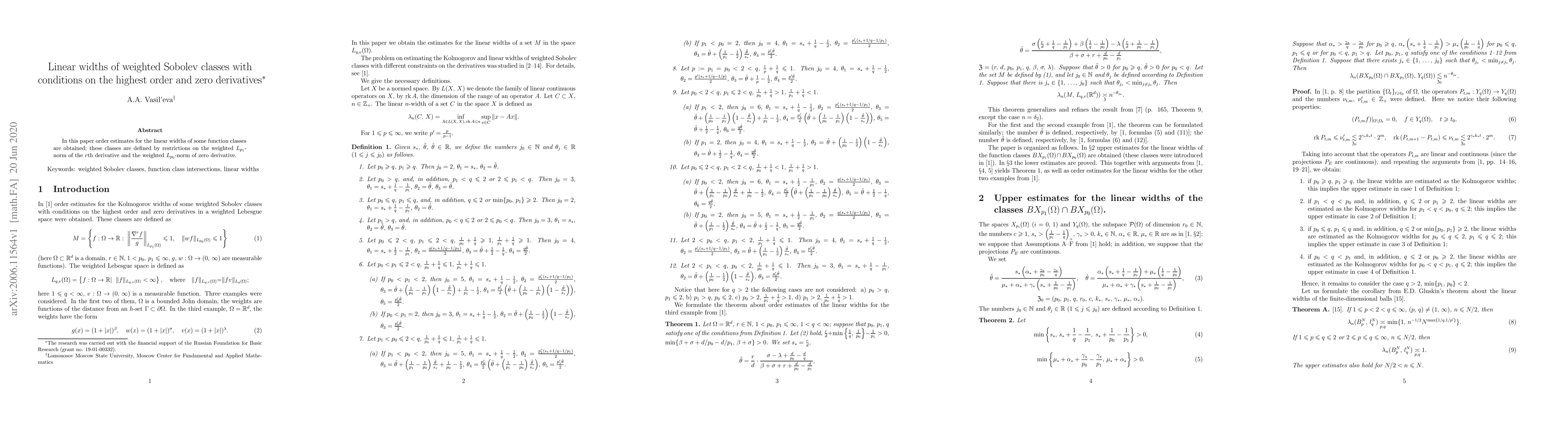 Summary: This paper provides estimates for the linear widths of function classes defined by weighted norms of their derivatives, focusing on conditions involving the highest-order and zero derivatives. The results offer insights into the geometric properties of these Sobolev classes.