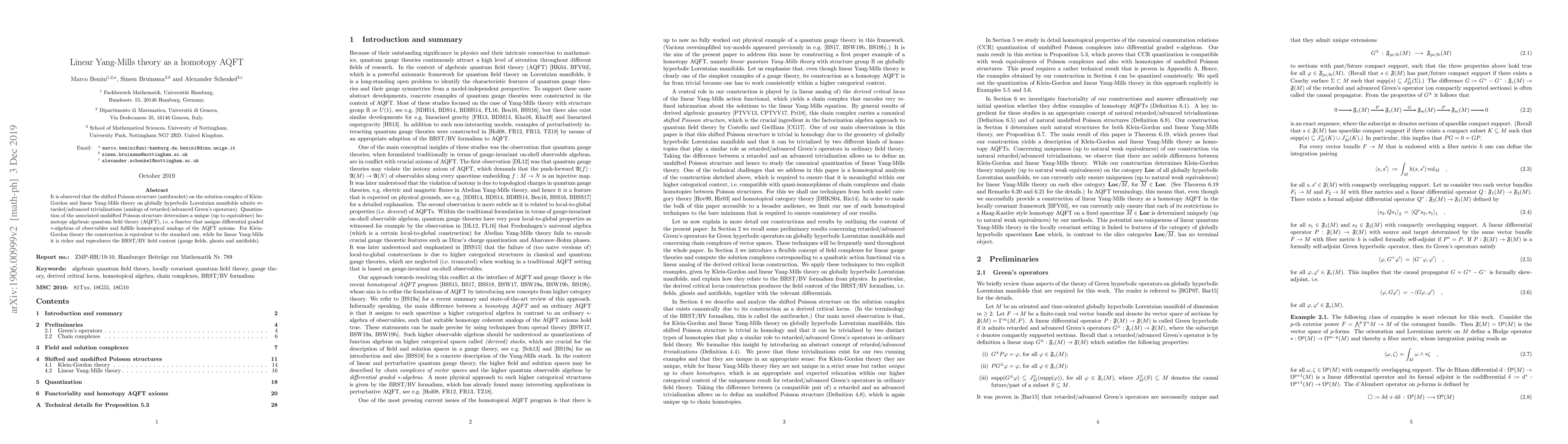 The paper introduces a homotopy-theoretic approach to constructing quantum field theories, specifically for linear Yang-Mills theory, using shifted Poisson structures and retarded/advanced trivializations.