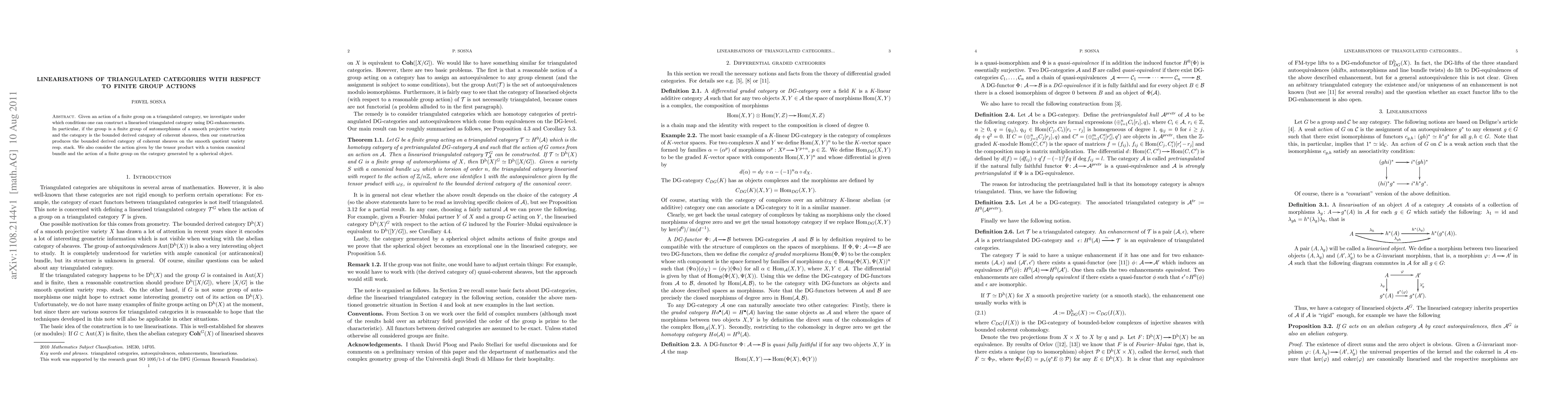 Summary: This paper explores the construction of linearised triangulated categories via DG-enhancements under finite group actions, focusing on scenarios where the group acts on the derived category of coherent sheaves on a smooth projective variety, yielding the derived category of the quotient variety or stack. It also examines specific group actions involving torsion canonical bundles and spherical objects.