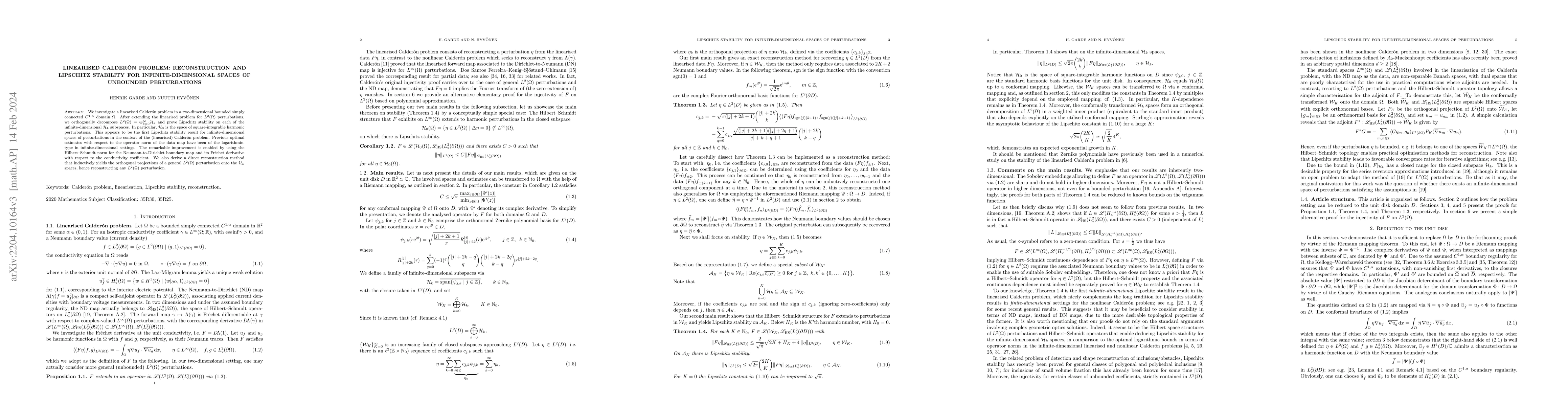 We investigate a linearised Calder\'on problem in a two-dimensional bounded simply connected $C^{1,\alpha}$ domain $\Omega$. After extending the linearised problem for $L^2(\Omega)$ perturbations, we orthogonally decompose $L^2(\Omega) = \oplus_{k=0}^\infty \mathcal{H}_k$ and prove Lipschitz stability on each of the infinite-dimensional $\mathcal{H}_k$ subspaces. In particular, $\mathcal{H}_0$ is the space of square-integrable harmonic perturbations. This appears to be the first Lipschitz stability result for infinite-dimensional spaces of perturbations in the context of the (linearised) Calder\'on problem. Previous optimal estimates with respect to the operator norm of the data map have been of the logarithmic-type in infinite-dimensional settings. The remarkable improvement is enabled by using the Hilbert-Schmidt norm for the Neumann-to-Dirichlet boundary map and its Fr\'echet derivative with respect to the conductivity coefficient. We also derive a direct reconstruction method that inductively yields the orthogonal projections of a general $L^2(\Omega)$ perturbation onto the $\mathcal{H}_k$ spaces, hence reconstructing any $L^2(\Omega)$ perturbation.
