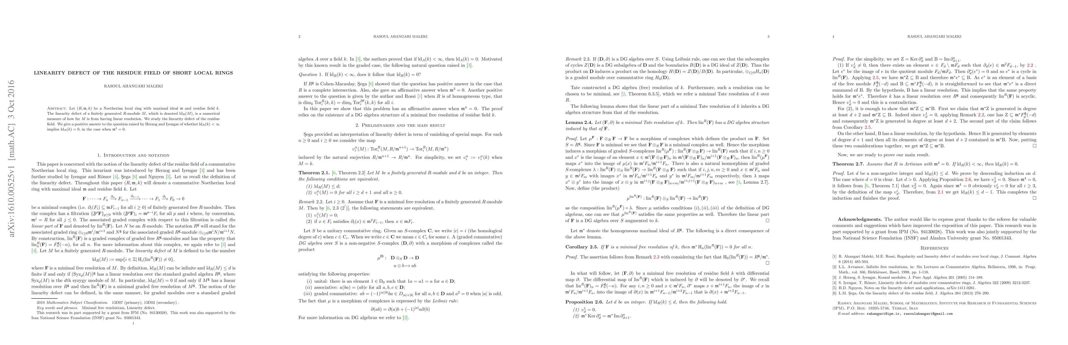 This paper investigates the linearity defect of the residue field $k$ in a Noetherian local ring $R$ with $\m^4=0$. It confirms that if $\ld_R(k)<\infty$, then $\ld_R(k)=0$, resolving a question posed by Herzog and Iyengar.