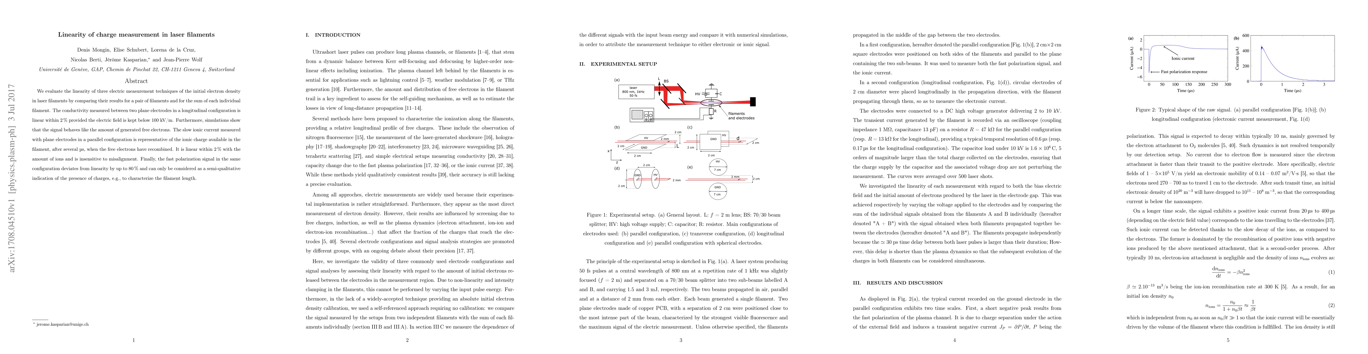 The research paper evaluates the linearity of electric measurement techniques for laser filaments, finding that two methods provide accurate results within 2% of the initial electron density, while a third method deviates by up to 80%.
