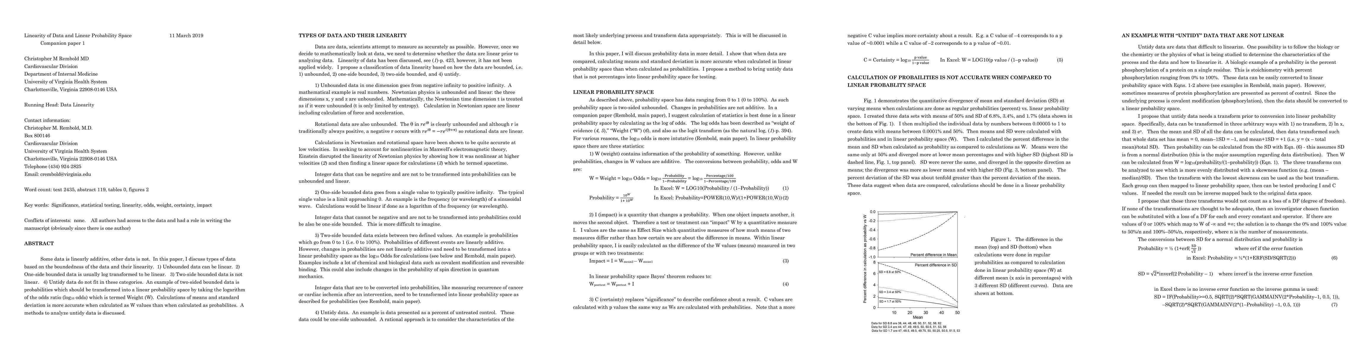 Some data is linearly additive, other data is not. In this paper, I discuss types of data based on the boundedness of the data and their linearity. 1) Unbounded data can be linear. 2) One-side bounded data is usually log transformed to be linear. 3) Two-side bounded data is not linear. 4) Untidy data do not fit in these categories. An example of two-sided bounded data is probabilities which should be transformed into a linear probability space by taking the logarithm of the odds ratio (log10 odds) which is termed Weight (W). Calculations of means and standard deviation is more accurate when calculated as W values than when calculated as probabilities. A methods to analyze untidy data is discussed.