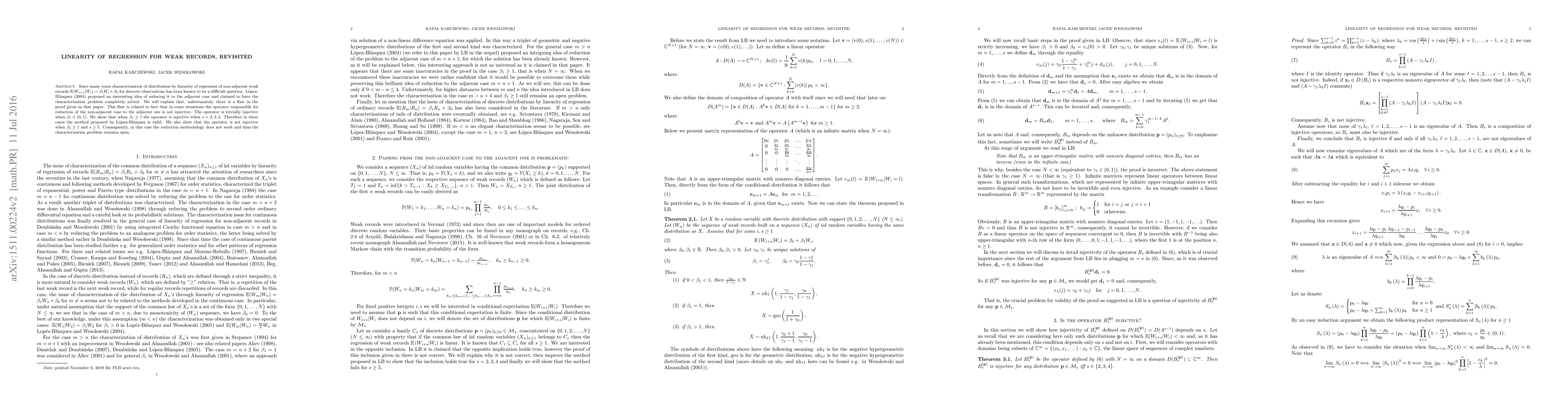 Since many years characterization of distribution by linearity of regression of non-adjacent weak records E(W_{i+s}|W_i) = \beta_1 W_i+\beta_0 for discrete observations has been known to be a difficult question. Lopez- Blazquez (2004) proposed an interesting idea of reducing it to the adjacent case and claimed to have the characterization problem completely solved. We will explain that, unfortunately, there is a major aw in the proof given in that paper. This aw is related to fact that in some situations the operator responsible for reduction of the non-adjacent case to the adjacent one is not injective. The operator is trivially injective when 0<\beta_1<1. We show that when \beta_1>=1 the operator is injective when s = 2, 3, 4. Therefore in these cases the method proposed by Lopez-Blazquez is valid. We also show that the operator is not injective when \beta_1 >=1 and s >= 5. Consequently, in this case the reduction methodology does not work and thus the characterization problem remains open.