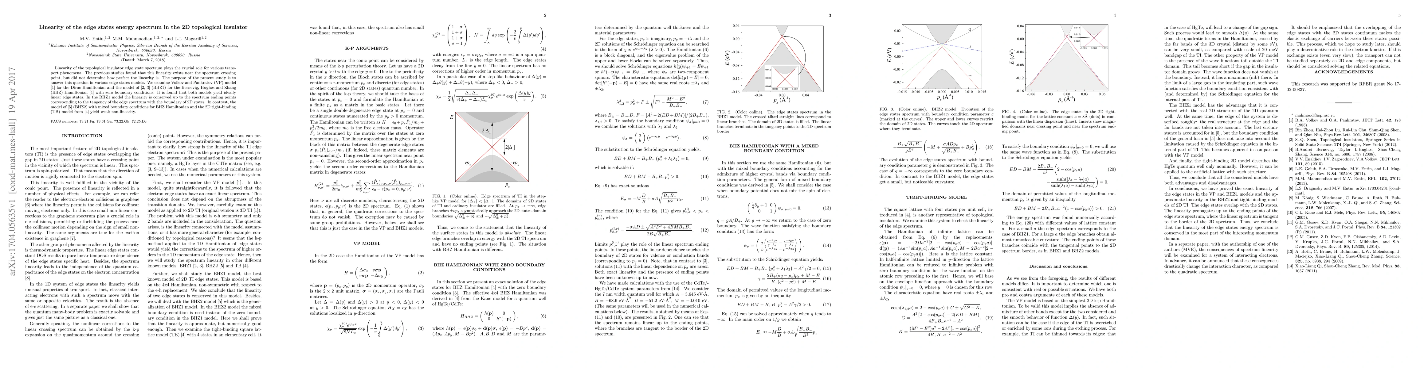 This study investigates the linearity of edge states in 2D topological insulators, finding that the Volkov and Pankratov model and the Bernevig, Hughes, and Zhang model with zero boundary conditions exhibit ideally linear edge states, while the BHZ model with mixed boundary conditions and a 2D tight-binding model show weak non-linearity.