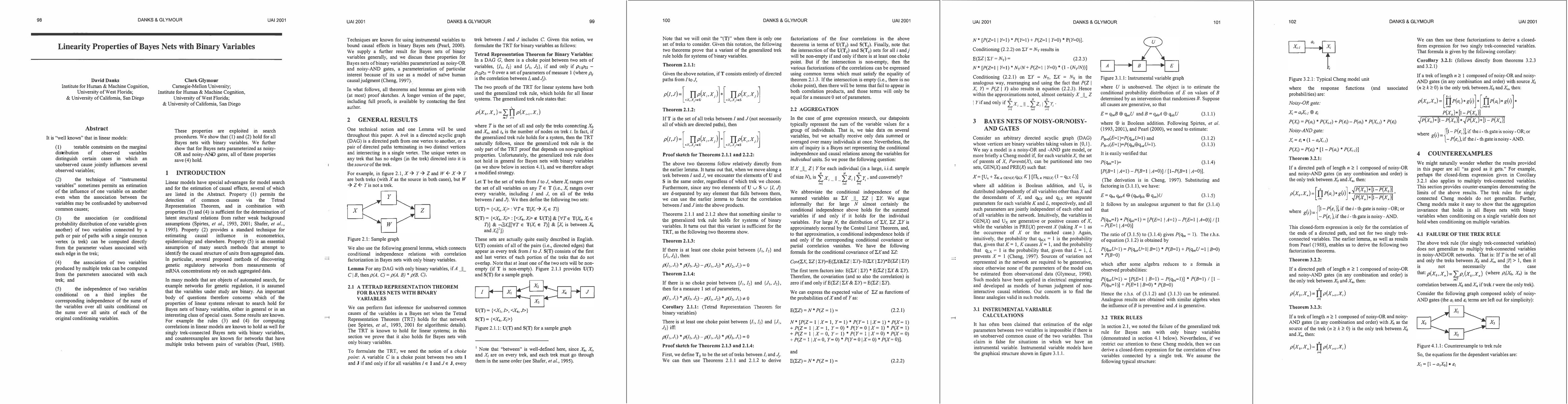 It is "well known" that in linear models: (1) testable constraints on the marginal distribution of observed variables distinguish certain cases in which an unobserved cause jointly influences several observed variables; (2) the technique of "instrumental variables" sometimes permits an estimation of the influence of one variable on another even when the association between the variables may be confounded by unobserved common causes; (3) the association (or conditional probability distribution of one variable given another) of two variables connected by a path or trek can be computed directly from the parameter values associated with each edge in the path or trek; (4) the association of two variables produced by multiple treks can be computed from the parameters associated with each trek; and (5) the independence of two variables conditional on a third implies the corresponding independence of the sums of the variables over all units conditional on the sums over all units of each of the original conditioning variables.These properties are exploited in search procedures. It is also known that properties (2)-(5) do not hold for all Bayes nets with binary variables. We show that (1) holds for all Bayes nets with binary variables and (5) holds for all singly trek-connected Bayes nets of that kind. We further show that all five properties hold for Bayes nets with any DAG and binary variables parameterized with noisy-or and noisy-and gates.