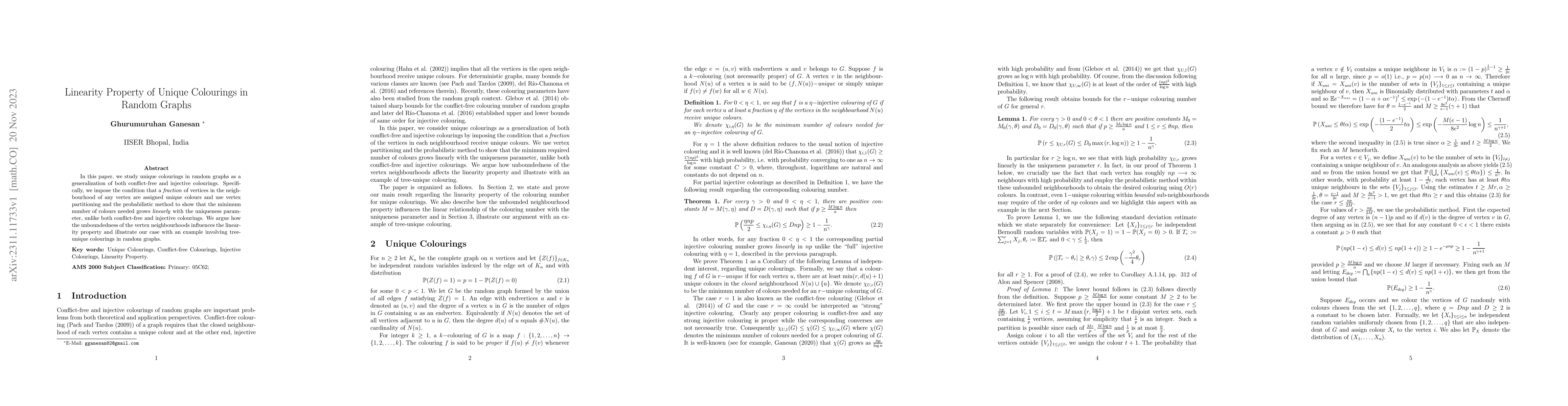 This paper explores unique colourings in random graphs, demonstrating that the minimum number of colours required grows linearly with the uniqueness parameter, contrasting with conflict-free and injective colourings. The study uses vertex partitioning and the probabilistic method to illustrate how the unboundedness of vertex neighbourhoods influences this linearity property.