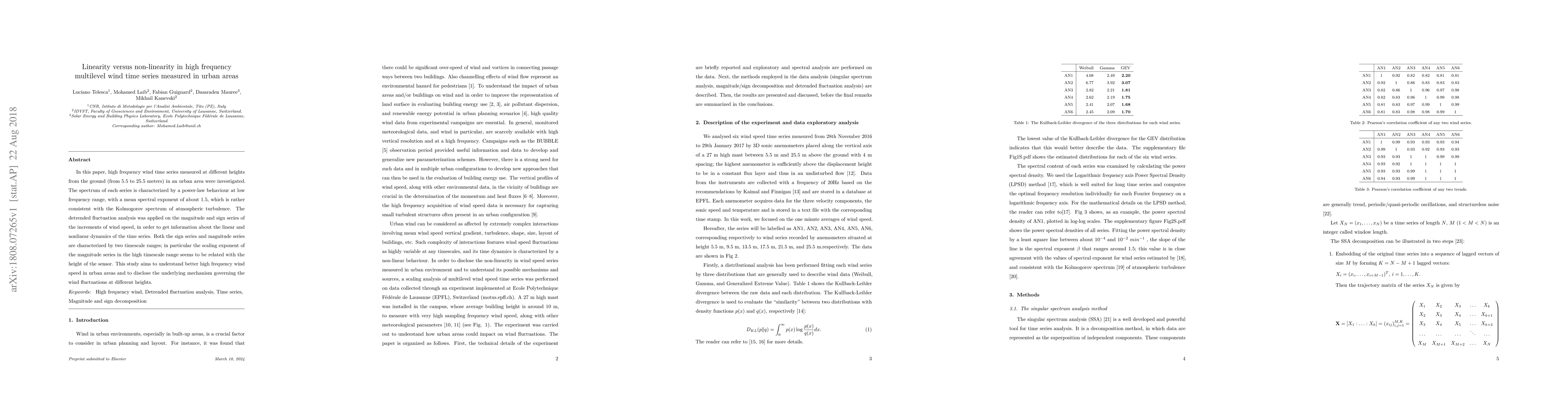 This paper investigates high frequency wind time series in urban areas, revealing a power-law spectrum consistent with atmospheric turbulence. Detrended fluctuation analysis reveals both linear and nonlinear dynamics, with scaling exponents in the magnitude series linked to sensor height, aiming to better understand wind fluctuations in urban settings.