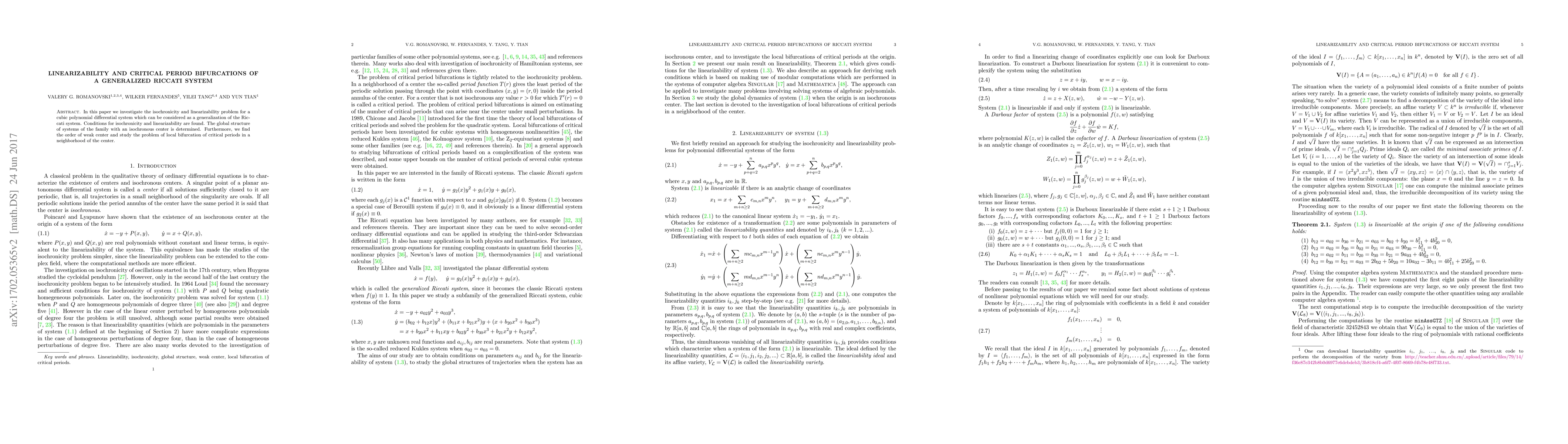 This paper explores the linearizability and critical period bifurcations of a generalized Riccati system, identifying conditions for isochronicity and linearizability, determining the global structure of systems with an isochronous center, and investigating local bifurcations near the center.