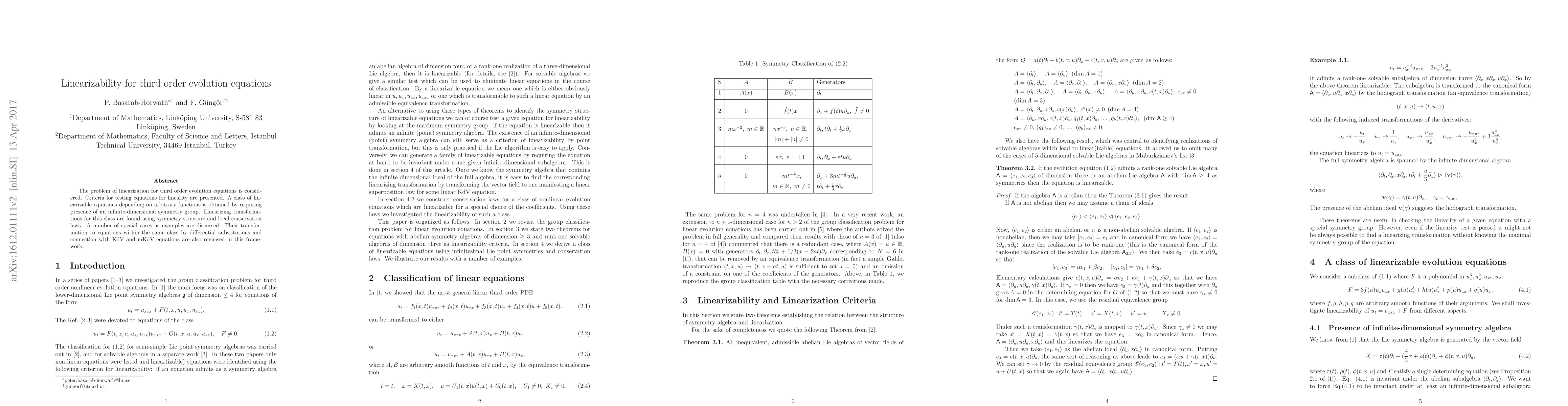 Researchers developed criteria for testing linearity in third-order evolution equations and identified a class of linearizable equations using an infinite-dimensional symmetry group. They also found transformation methods using symmetry structure and local conservation laws.