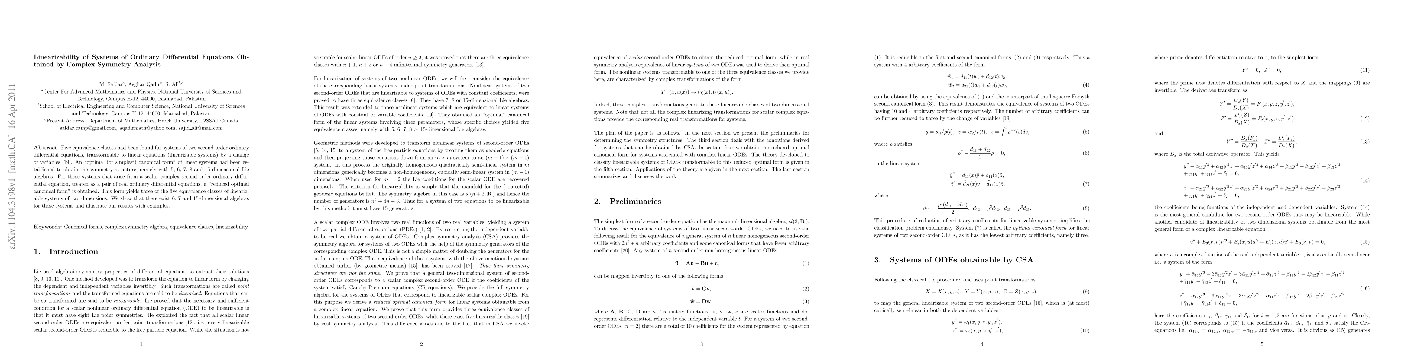 Five equivalence classes had been found for systems of two second-order ordinary differential equations, transformable to linear equations (linearizable systems) by a change of variables. An "optimal (or simplest) canonical form" of linear systems had been established to obtain the symmetry structure, namely with 5, 6, 7, 8 and 15 dimensional Lie algebras. For those systems that arise from a scalar complex second-order ordinary differential equation, treated as a pair of real ordinary differential equations, a "reduced optimal canonical form" is obtained. This form yields three of the five equivalence classes of linearizable systems of two dimensions. We show that there exist 6, 7 and 15-dimensional algebras for these systems and illustrate our results with examples.