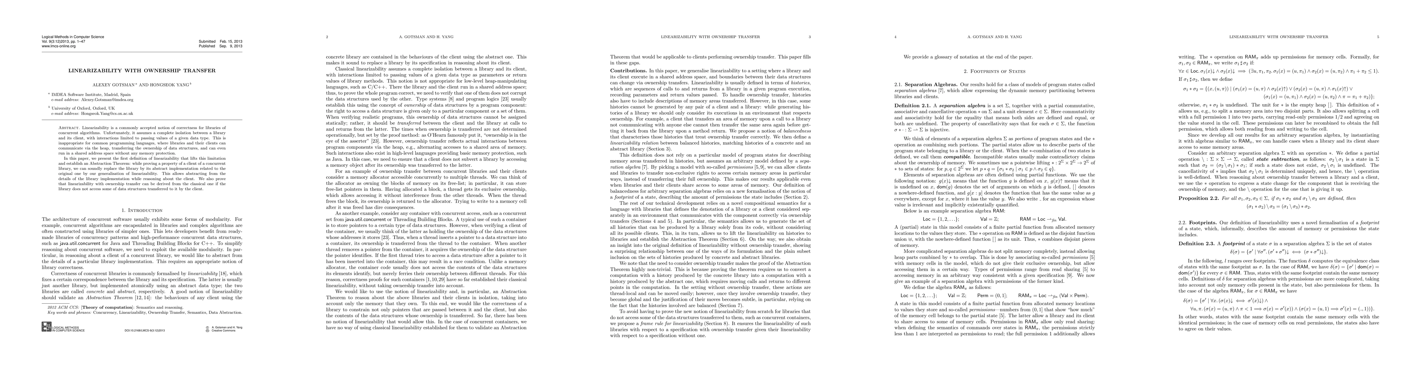 This paper introduces a new definition of linearizability that accommodates ownership transfer between concurrent library and client, allowing communication via the heap. It establishes an Abstraction Theorem that enables reasoning about clients without delving into the library's implementation details, provided the library does not access transferred data.