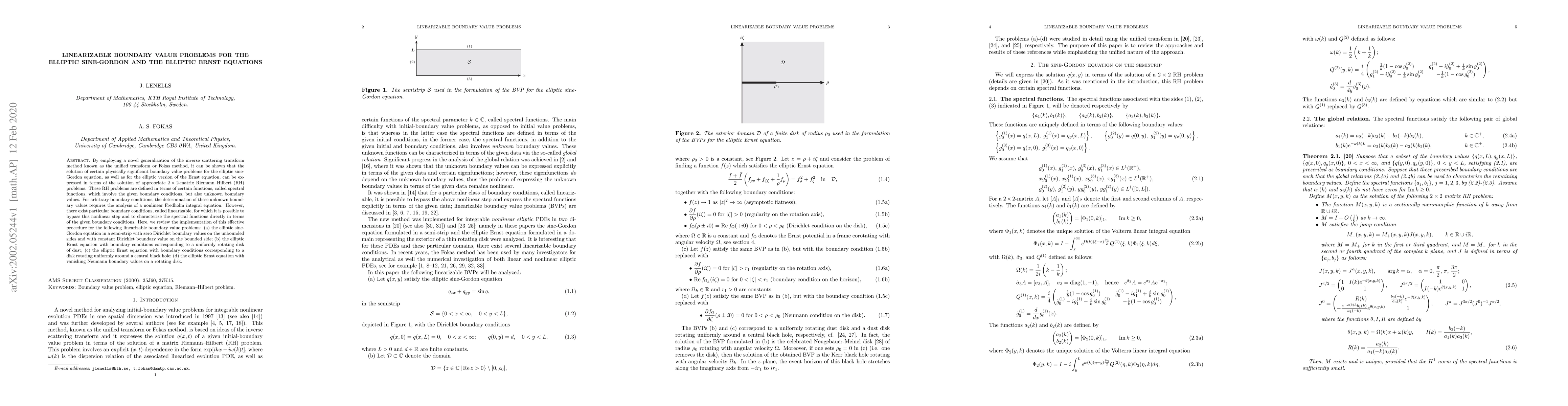 By employing a novel generalization of the inverse scattering transform method known as the unified transform or Fokas method, it can be shown that the solution of certain physically significant boundary value problems for the elliptic sine-Gordon equation, as well as for the elliptic version of the Ernst equation, can be expressed in terms of the solution of appropriate $2 \times 2$-matrix Riemann--Hilbert (RH) problems. These RH problems are defined in terms of certain functions, called spectral functions, which involve the given boundary conditions, but also unknown boundary values. For arbitrary boundary conditions, the determination of these unknown boundary values requires the analysis of a nonlinear Fredholm integral equation. However, there exist particular boundary conditions, called linearizable, for which it is possible to bypass this nonlinear step and to characterize the spectral functions directly in terms of the given boundary conditions. Here, we review the implementation of this effective procedure for the following linearizable boundary value problems: (a) the elliptic sine-Gordon equation in a semi-strip with zero Dirichlet boundary values on the unbounded sides and with constant Dirichlet boundary value on the bounded side; (b) the elliptic Ernst equation with boundary conditions corresponding to a uniformly rotating disk of dust; (c) the elliptic Ernst equation with boundary conditions corresponding to a disk rotating uniformly around a central black hole; (d) the elliptic Ernst equation with vanishing Neumann boundary values on a rotating disk.