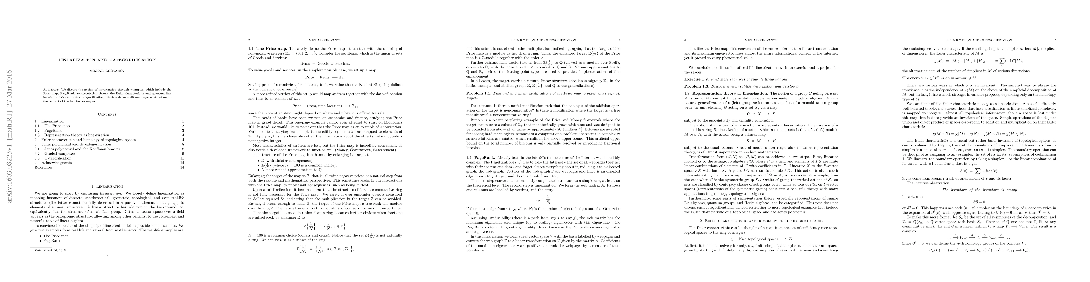 We discuss the notion of linearization through examples, which include the Price map, PageRank, representation theory, the Euler characteristic and quantum invariants. We also review categorification, which adds an additional layer of structure, in the context of the last two examples.