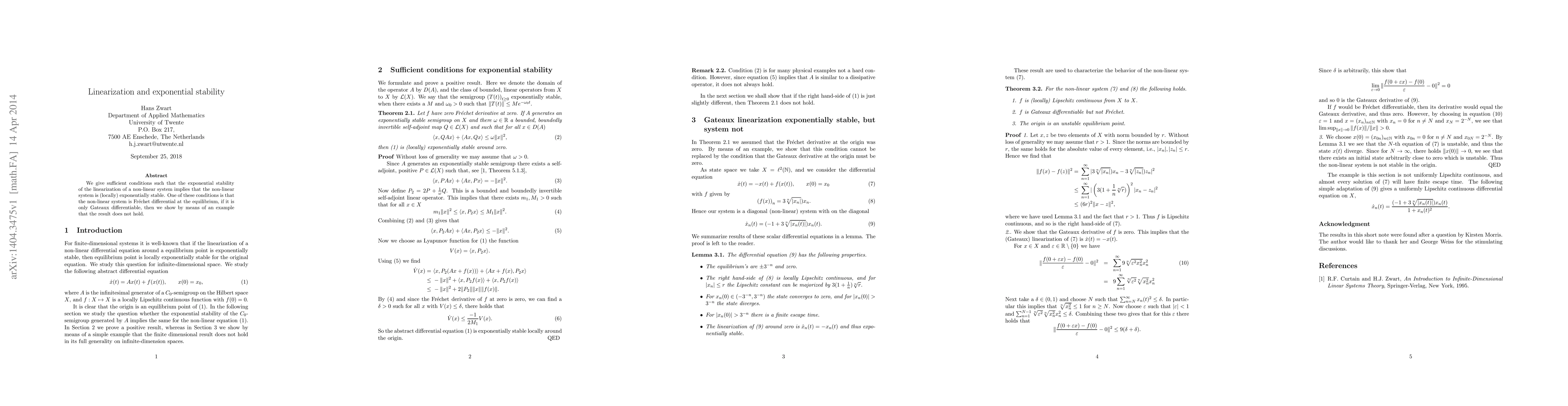 This paper presents conditions ensuring exponential stability of a nonlinear system from the exponential stability of its linearization around an equilibrium point. It highlights that Fréchet differentiability is necessary, as Gateaux differentiability alone does not guarantee the same stability outcome, illustrated through an example.
