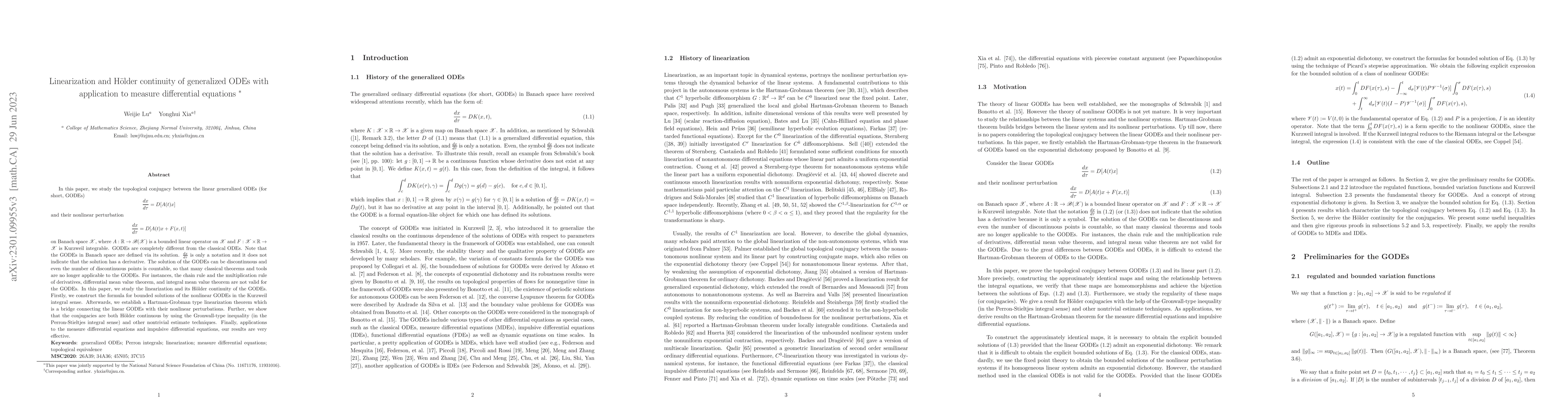 In this paper, we study the topological conjugacy between the linear generalized ODEs (for short, GODEs) \[ \frac{dx}{d\tau}=D[A(t)x] \] and their nonlinear perturbation \[ \frac{dx}{d\tau}=D[A(t)x+F(x,t)] \] on Banach space $\mathscr{X}$, where $A:\mathbb{R}\to\mathscr{B}(\mathscr{X})$ is a bounded linear operator on $\mathscr{X}$ and $F:\mathscr{X}\times \mathbb{R}\to \mathscr{X}$ is Kurzweil integrable. GODEs are completely different from the classical ODEs. Note that the GODEs in Banach space are defined via its solution. $\frac{dx}{d\tau}$ is only a notation and %$\frac{dx}{d\tau}$ it does not indicate that the solution has a derivative. The solution of the GODEs can be discontinuous and even the number of discontinuous points is countable, so that many classical theorems and tools are no longer applicable to the GODEs. For instances, the chain rule and the multiplication rule of derivatives, differential mean value theorem, and integral mean value theorem are not valid for the GODEs. In this paper, we study the linearization and its H\"{o}lder continuity of the GODEs. Firstly, we construct the formula for bounded solutions of the nonlinear GODEs in the Kurzweil integral sense. Afterwards, we establish a Hartman-Grobman type linearization theorem which is a bridge connecting the linear GODEs with their nonlinear perturbations. Further, we show that the conjugacies are both H\"{o}lder continuous by using the Gronwall-type inequality (in the Perron-Stieltjes integral sense) and other nontrivial estimate techniques. %The GODEs include measure differential equations, impulsive differential equations, functional differential equations and the classical ordinary differential equations as special cases. Finally, applications to the measure differential equations and impulsive differential equations, our results are very effective.