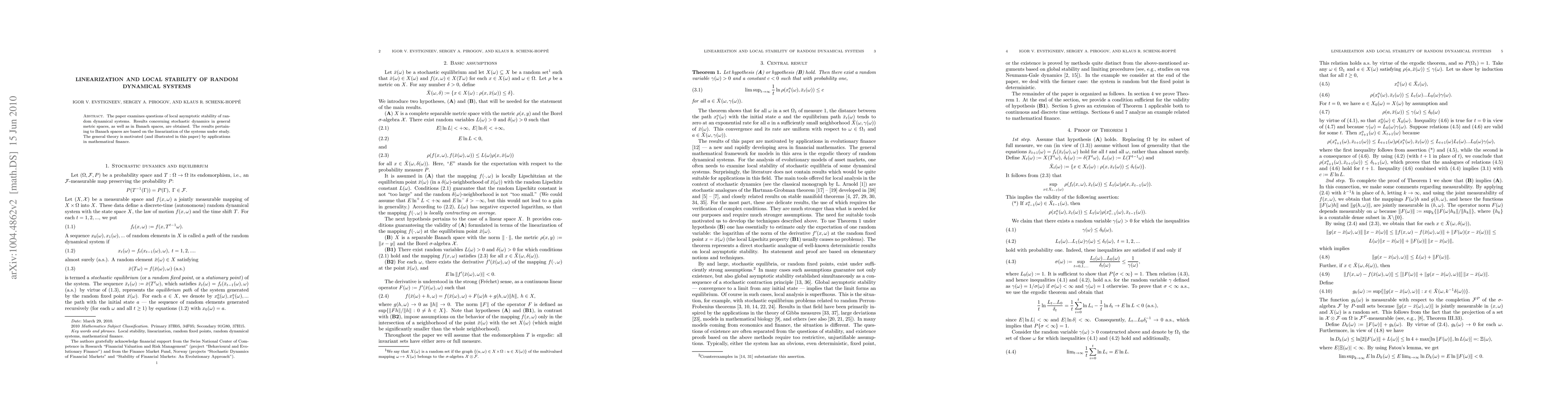 The paper examines questions of local asymptotic stability of random dynamical systems. Results concerning stochastic dynamics in general metric spaces, as well as in Banach spaces, are obtained. The results pertaining to Banach spaces are based on the linearization of the systems under study. The general theory is motivated (and illustrated in this paper) by applications in mathematical finance.