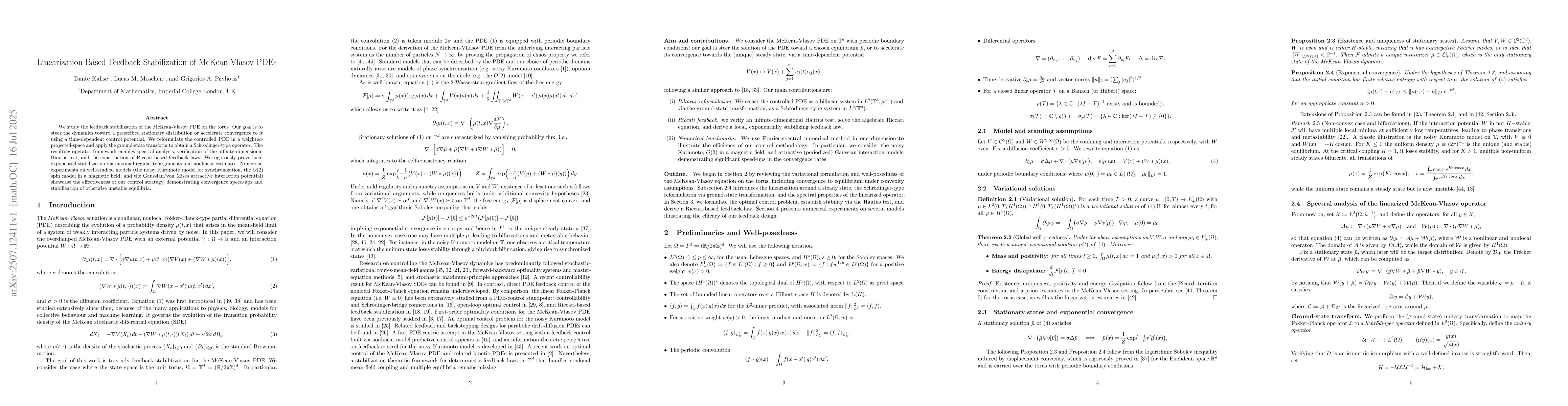 We study the feedback stabilization of the McKean-Vlasov PDE on the torus. Our goal is to steer the dynamics toward a prescribed stationary distribution or accelerate convergence to it using a time-dependent control potential. We reformulate the controlled PDE in a weighted-projected space and apply the ground-state transform to obtain a Schrodinger-type operator. The resulting operator framework enables spectral analysis, verification of the infinite-dimensional Hautus test, and the construction of Riccati-based feedback laws. We rigorously prove local exponential stabilization via maximal regularity arguments and nonlinear estimates. Numerical experiments on well-studied models (the noisy Kuramoto model for synchronization, the O(2) spin model in a magnetic field, and the Gaussian/von Mises attractive interaction potential) showcase the effectiveness of our control strategy, demonstrating convergence speed-ups and stabilization of otherwise unstable equilibria.