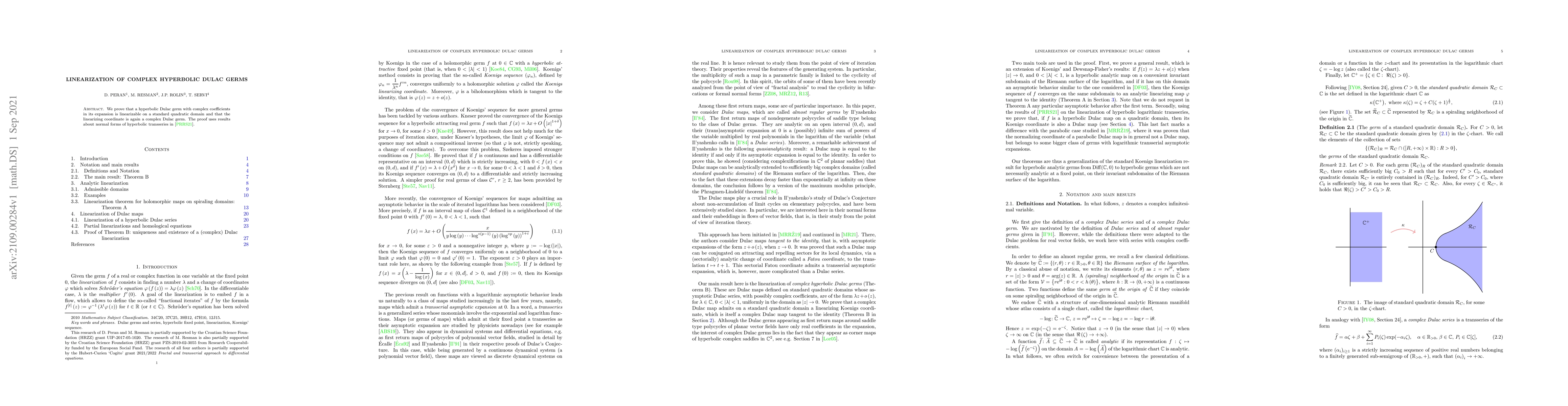 Summary: This paper demonstrates the linearization of hyperbolic Dulac germs with complex coefficients on a standard quadratic domain, showing that the linearizing coordinate remains a complex Dulac germ, utilizing prior results on hyperbolic transseries normal forms.
