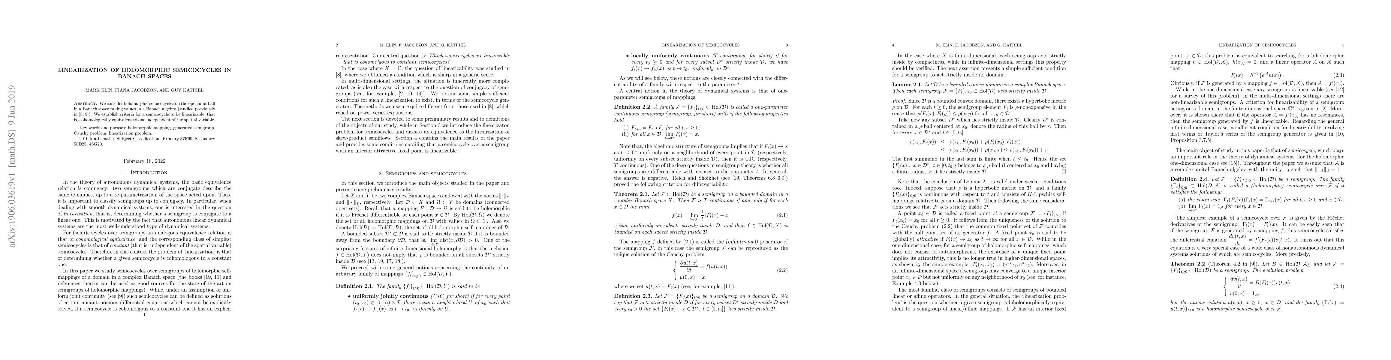 Summary: This paper investigates holomorphic semicocycles on the open unit ball in Banach spaces, providing criteria for their linearization, meaning they can be transformed into semicocycles that do not depend on the spatial variable. The focus is on establishing conditions under which such linearization is possible.