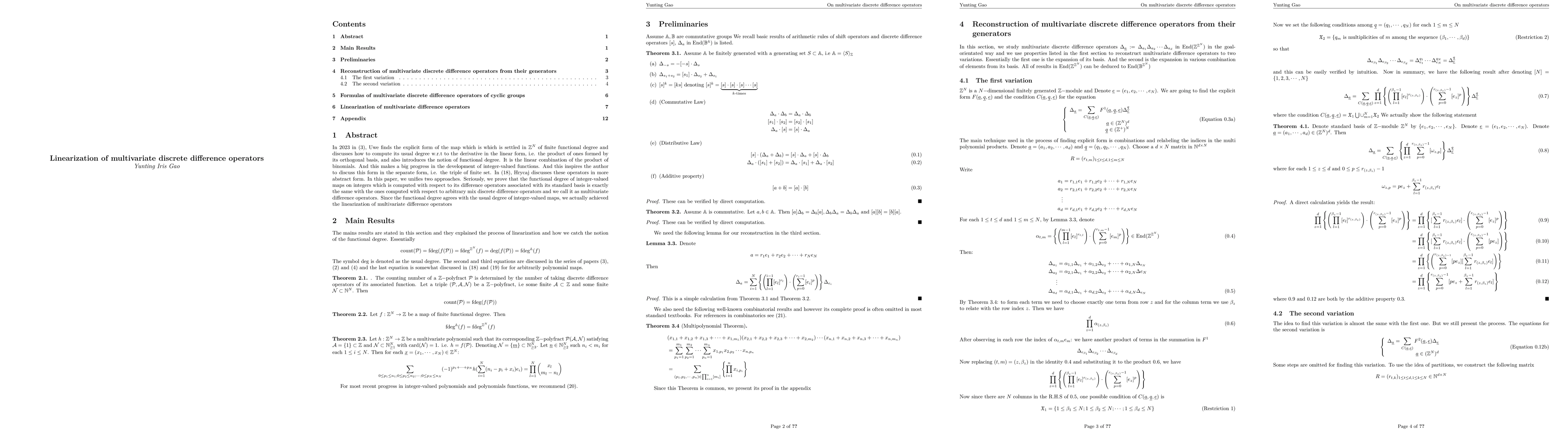 In 2023 in (3), Uwe finds the explicit form of the map which is which is settled in ZN of finite functional degree and14 discusses how to compute its usual degree w.r.t to the derivative in the linear form, i.e. the product of ones formed by15 its orthogonal basis, and also introduces the notion of functional degree. It is the linear combination of the product of16 binomials. And this makes a big progress in the development of integer-valued functions. And this inspires the author17 to discuss this form in the separate form, i.e. the triple of finite set. In (18), Hrycaj discusses these operators in more18 abstract form. In this paper, we unifies two approaches. Seriously, we prove that the functional degree of integer-valued19 maps on integers which is computed with respect to its difference operators associated with its standard basis is exactly20 the same with the ones computed with respect to arbitrary mix discrete difference operators and we call it as multivariate21 difference operators. Since the functional degree agrees with the usual degree of integer-valued maps, we actually achieved22 the linearization of multivariate difference operators