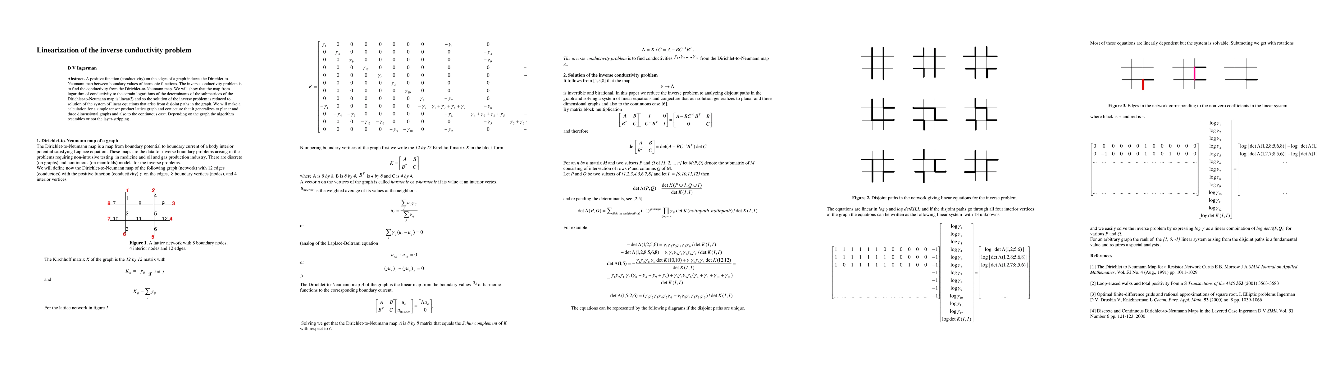 A positive function (conductivity) on the edges of a graph induces the Dirichlet-to- Neumann map between boundary values of harmonic functions. The inverse conductivity problem is to find the conductivity from the Dirichlet-to-Neumann map. We will show that the map from logarithm of conductivity to the certain logarithms of the determinants of the submatrices of the Dirichlet-to-Neumann map is linear(!) and so the solution of the inverse problem is reduced to solution of the system of linear equations that arise from disjoint paths in the graph. We will make a calculation for a simple tensor product lattice graph and conjecture that it generalizes to planar and three dimensional graphs and also to the continuous case. Depending on the graph the algorithm resembles or not the layer-stripping.