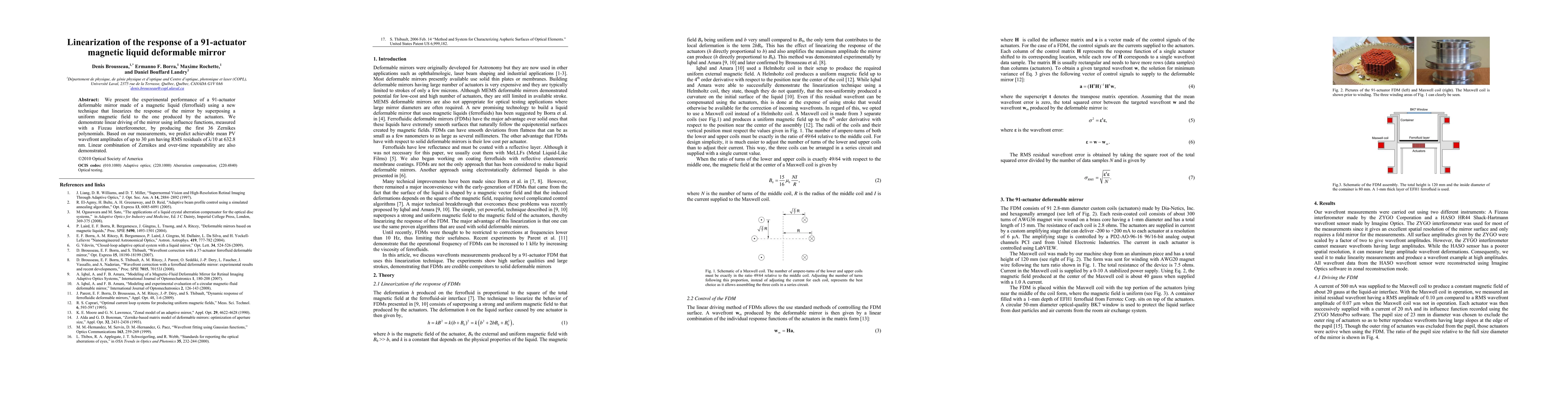 This paper details an experimental setup for a 91-actuator magnetic liquid deformable mirror, which uses a superimposed uniform magnetic field to linearize its response. The study demonstrates linear driving and the first 36 Zernike polynomials, predicting mean PV wavefront amplitudes up to 30 μm with RMS residuals of λ/10 at 632.8 nm.