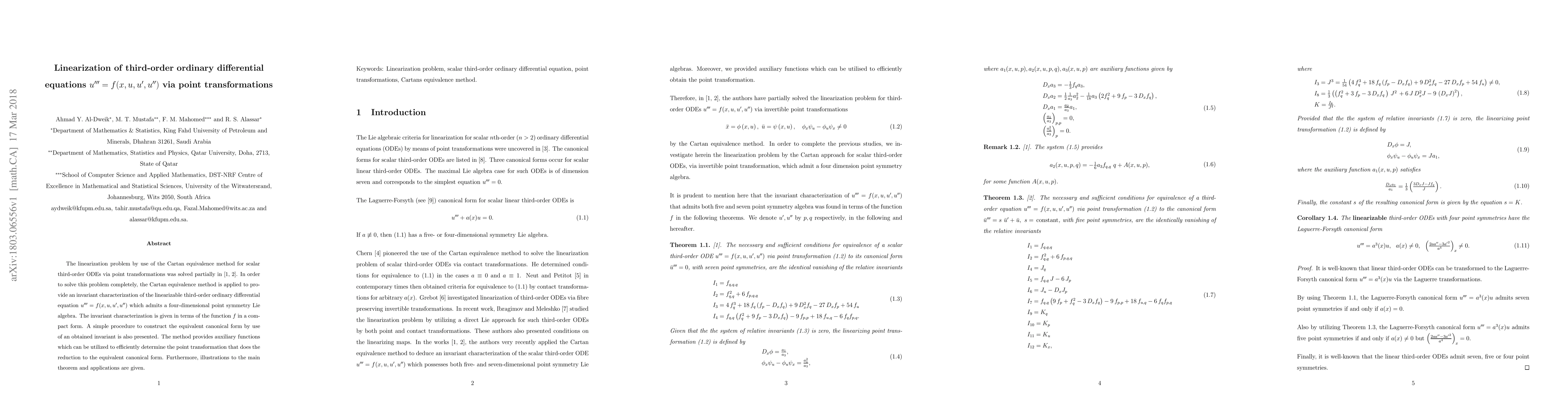 This paper presents a complete solution to the linearization of third-order ordinary differential equations using the Cartan equivalence method and point transformations. It provides an invariant characterization of linearizable equations admitting a four-dimensional point symmetry Lie algebra and a procedure to construct their equivalent canonical form.