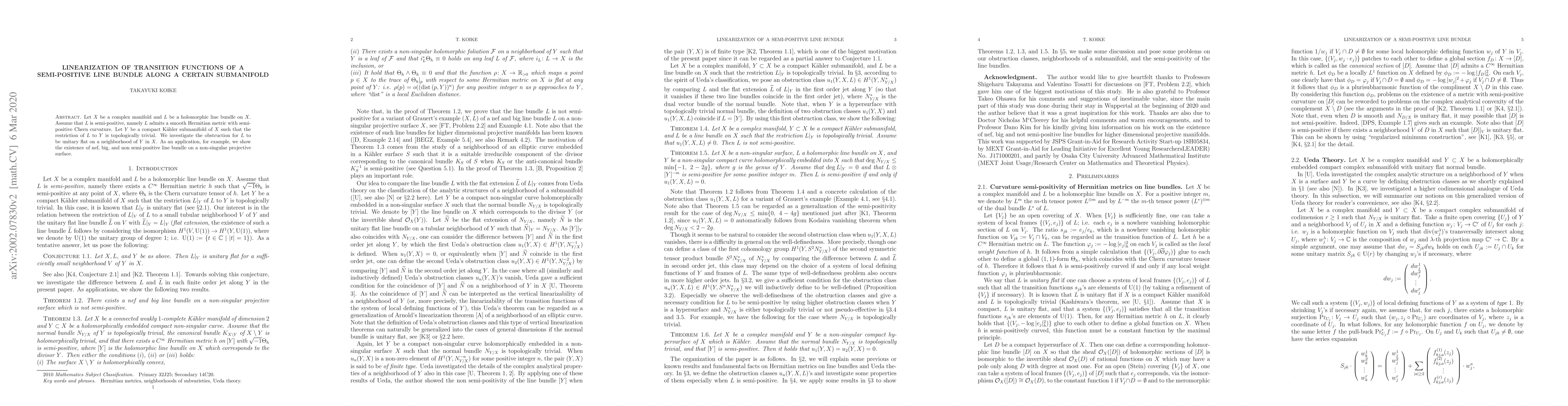 Let $X$ be a complex manifold and $L$ be a holomorphic line bundle on $X$. Assume that $L$ is semi-positive, namely $L$ admits a smooth Hermitian metric with semi-positive Chern curvature. Let $Y$ be a compact K\"ahler submanifold of $X$ such that the restriction of $L$ to $Y$ is topologically trivial. We investigate the obstruction for $L$ to be unitary flat on a neighborhood of $Y$ in $X$. As an application, for example, we show the existence of nef, big, and non semi-positive line bundle on a non-singular projective surface.