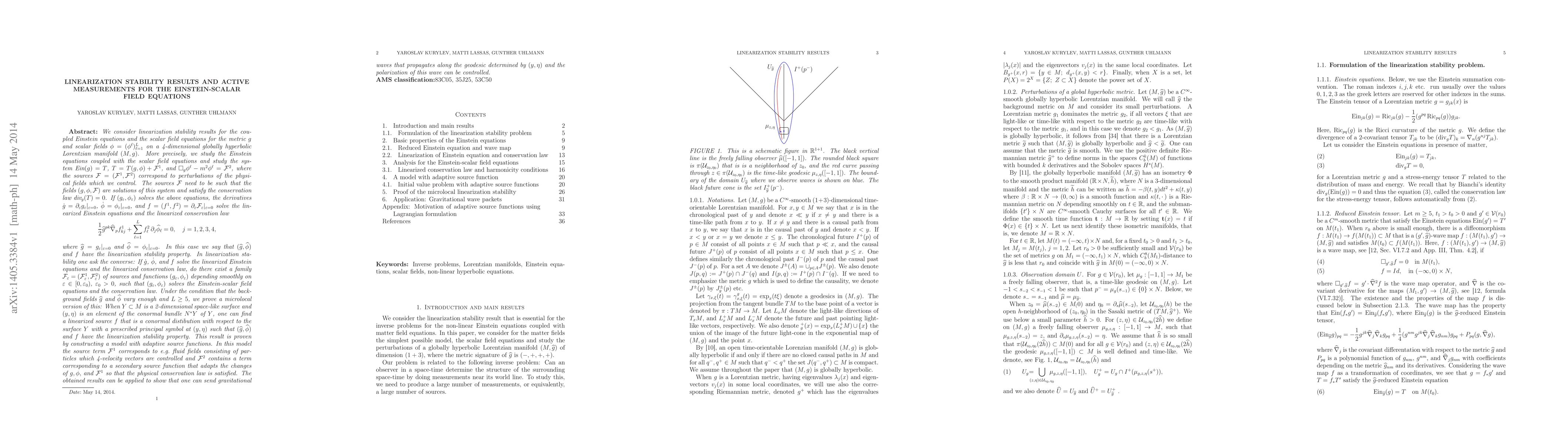 We study the Einstein equations coupled with the scalar field equations, $\hbox{Ein}(g)=T$, $T=T(g,\phi)+F^1$, and $\square_g\phi^\ell-m^2\phi^\ell= F^2$, where the sources $F=(F^1, F^2)$ correspond to perturbations of the physical fields which we control. Here $\phi=(\phi^\ell)_{\ell=1}^L$ and $(M,g)$ is a 4-dimensional globally hyperbolic Lorentzian manifold. The sources $F$ need to be such that the fields $(g,\phi,F)$ satisfy the conservation law $\hbox{div}_g(T)=0$. If $(g_\epsilon,\phi_\epsilon)$ solves the above equations, $\dot g=\partial_\epsilon g_\epsilon|_{\epsilon=0}$, $\dot\phi=\phi_\epsilon|_{\epsilon=0}$, and $f=(f^1,f^2)= \partial_\epsilon F_\epsilon|_{\epsilon=0}$ solve the linearized Einstein equations and the linearized conservation law $$ \frac 12 \hat g^{pk}\hat \nabla_p f^1_{kj}+ \sum_{\ell=1}^L f^2_\ell \, \partial_j\hat\phi_\ell=0, $$ where $\hat g= g_\epsilon|_{\epsilon=0}$ and $\hat \phi= \phi_\epsilon|_{\epsilon=0}$. Then $(\hat g,\hat \phi)$ and $f$ have the linearization stability property. Here ask the converse: If $\dot g$, $\dot \phi$, and $f$ solve the linearized Einstein equations and the linearized conservation law, are there $F_\epsilon=(F^1_\epsilon,F^2_\epsilon)$ and $(g_\epsilon,\phi_\epsilon)$ depending on $\epsilon\in [0,\epsilon_0)$, $\epsilon_0>0$, such that $(g_\epsilon,\phi_\epsilon)$ solves the Einstein-scalar field equations and the conservation law. When $\hat g$ and $\hat \phi$ vary enough and $L\geq 5$, we prove a microlocal version of this: When $Y\subset M$ is a 2-surface and $(y,\eta)\in N^*Y$, there is $f$ that is a conormal distibutions wrt. the surface $Y$ with a given principal symbol at $(y,\eta)$ such that $(\hat g,\hat \phi)$ and $f$ have the linearization stability property.