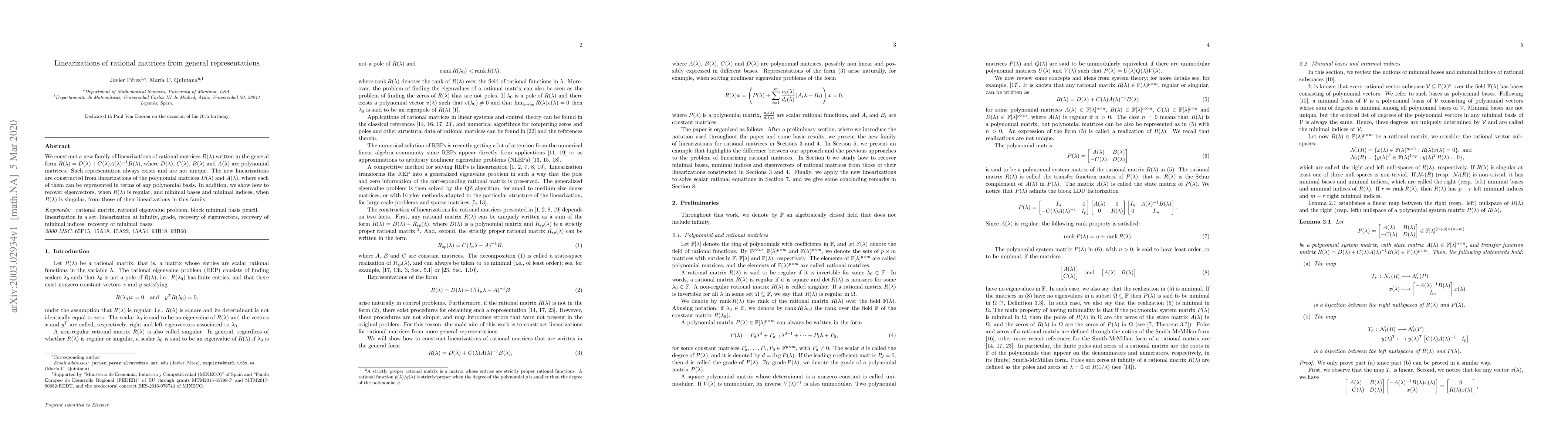 This paper introduces a new family of linearizations for rational matrices expressed in the general form $R(\lambda) = D(\lambda) + C(\lambda)A(\lambda)^{-1}B(\lambda)$. It also demonstrates how to recover eigenvectors and minimal bases from these linearizations, especially when $R(\lambda)$ is singular.