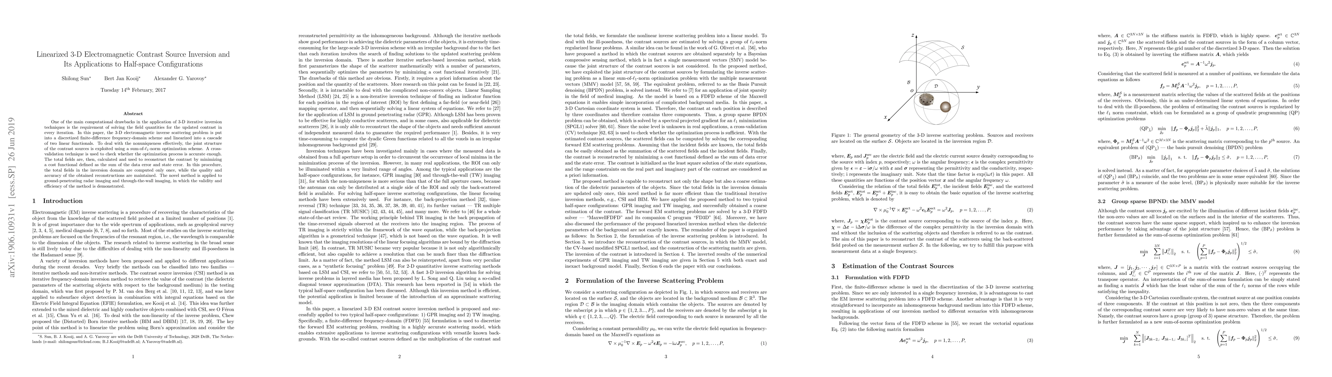 One of the main computational drawbacks in the application of 3-D iterative inversion techniques is the requirement of solving the field quantities for the updated contrast in every iteration. In this paper, the 3-D electromagnetic inverse scattering problem is put into a discretized finite-difference frequency-domain scheme and linearized into a cascade of two linear functionals. To deal with the nonuniqueness effectively, the joint structure of the contrast sources is exploited using a sum-of-$\ell_1$-norm optimization scheme. A cross-validation technique is used to check whether the optimization process is accurate enough. The total fields are, then, calculated and used to reconstruct the contrast by minimizing a cost functional defined as the sum of the data error and state error. In this procedure, the total fields in the inversion domain are computed only once, while the quality and accuracy of the obtained reconstructions are maintained. The novel method is applied to ground-penetrating radar imaging and through-the-wall imaging, in which the validity and efficiency of the method is demonstrated.
