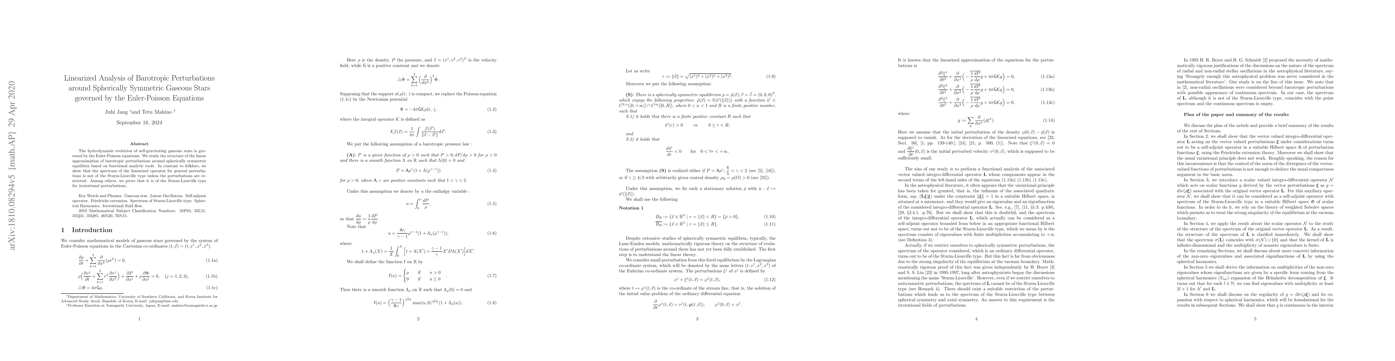 This paper investigates the linear approximation of barotropic perturbations around spherically symmetric gaseous stars governed by Euler-Poisson equations. Contrary to common belief, it demonstrates that the spectrum of the linearized operator is not generally Sturm-Liouville unless restricted to irrotational perturbations.