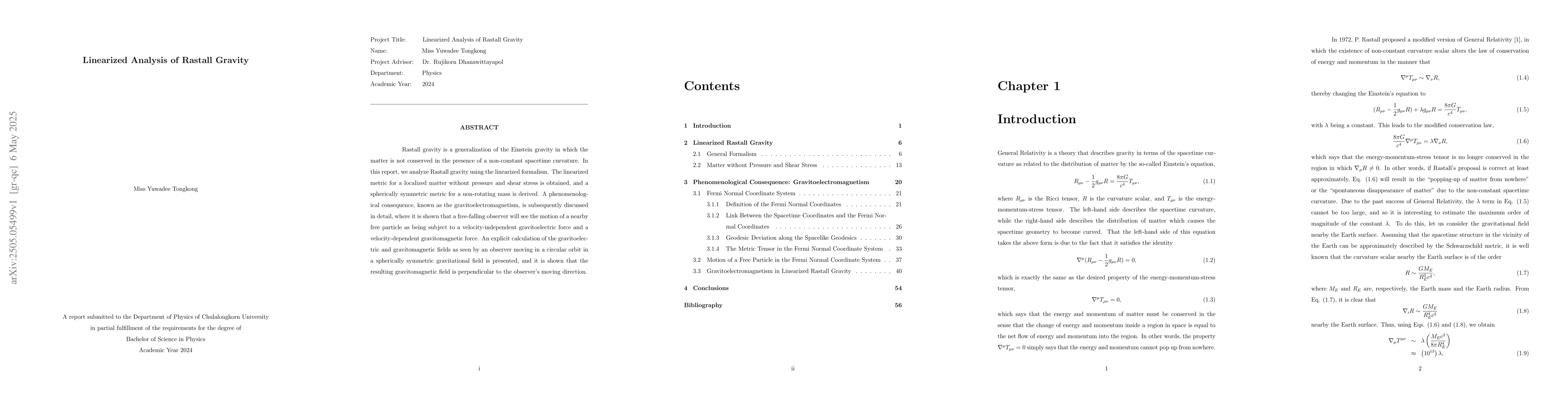 The paper presents a detailed linearized analysis of Rastall gravity, deriving specific metrics and calculating gravitoelectric and gravitomagnetic fields for a spherically symmetric, non-rotating mass.