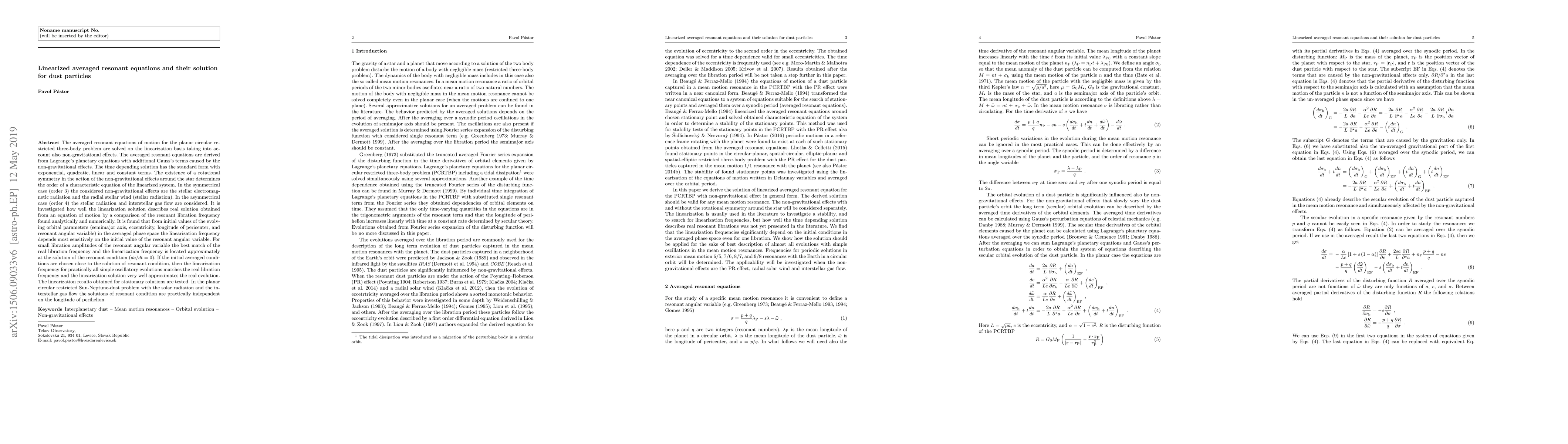 The averaged resonant equations of motion for the planar circular restricted three-body problem are solved on the linearization basis taking into account also non-gravitational effects. The averaged resonant equations are derived from Lagrange's planetary equations with additional Gauss's terms caused by the non-gravitational effects. The time depending solution has the standard form with exponential, quadratic, linear and constant terms. The existence of a rotational symmetry in the action of the non-gravitational effects around the star determines the order of a characteristic equation of the linearized system. In the symmetrical case (order 3) the considered non-gravitational effects are the stellar electromagnetic radiation and the radial stellar wind (stellar radiation). In the asymmetrical case (order 4) the stellar radiation and interstellar gas flow are considered. It is investigated how well the linearization solution describes real solution obtained from an equation of motion by a comparison of the resonant libration frequency found analytically and numerically. It is found that from initial values of the evolving orbital parameters (semimajor axis, eccentricity, longitude of pericenter, and resonant angular variable) in the averaged phase space the linearization frequency depends most sensitively on the initial value of the resonant angular variable. For small libration amplitudes of the resonant angular variable the best match of the real libration frequency and the linearization frequency is located approximately at the solution of the resonant condition ($da / dt$ $=$ 0). If the initial averaged conditions are chosen close to the solution of resonant condition, then the linearization frequency for practically all simple oscillatory evolutions matches the real libration frequency and the linearization solution very well approximates the real evolution.