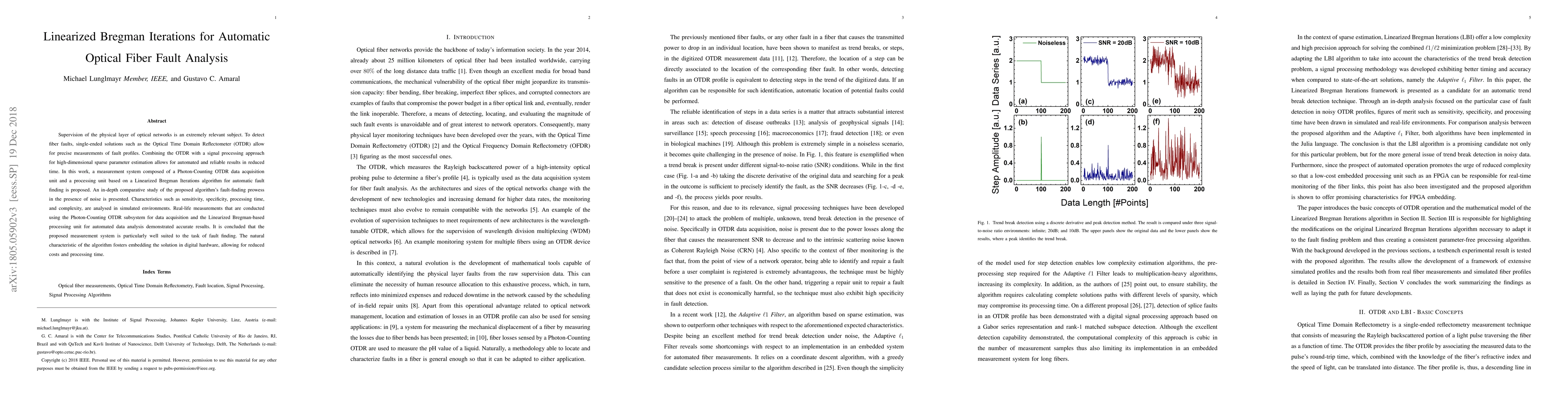 This paper proposes a measurement system using a Photon-Counting OTDR and a Linearized Bregman Iterations algorithm for automatic optical fiber fault analysis, demonstrating high accuracy and efficiency in fault detection, even in noisy environments. The system's suitability for digital hardware integration further reduces costs and processing time.