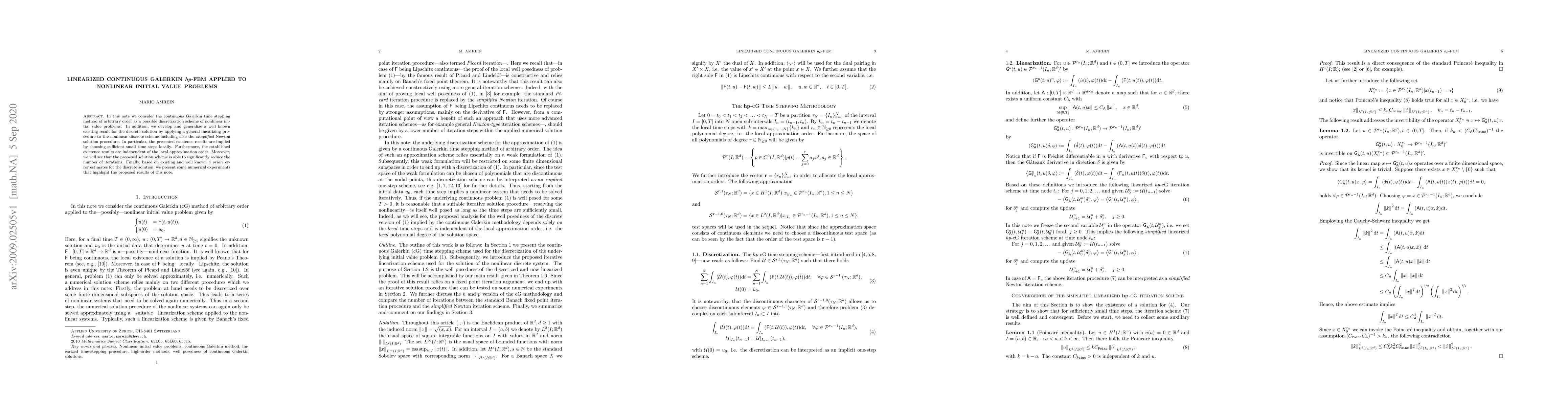 In this note we consider the continuous Galerkin time stepping method of arbitrary order as a possible discretization scheme of nonlinear initial value problems. In addition, we develop and generalize a well known existing result for the discrete solution by applying a general linearizing procedure to the nonlinear discrete scheme including also the simplified Newton solution procedure. In particular, the presented existence results are implied by choosing sufficient small time steps locally. Furthermore, the established existence results are independent of the local approximation order. Moreover, we will see that the proposed solution scheme is able to significantly reduce the number of iterations. Finally, based on existing and well known a priori error estimates for the discrete solution, we present some numerical experiments that highlight the proposed results of this note.