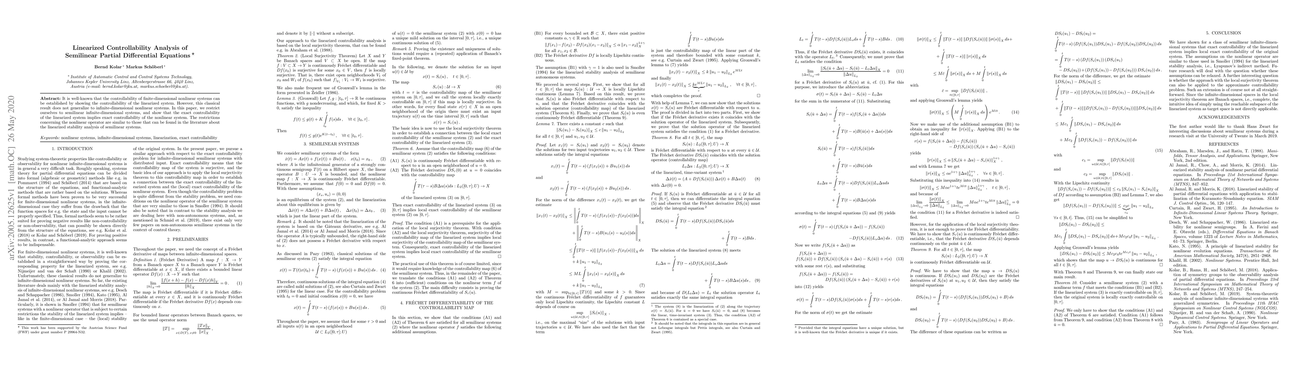 This paper shows that if a semilinear partial differential equation is linearizable to a controllable system, then the original nonlinear system is also exactly controllable, generalizing a classical result to infinite-dimensional systems.