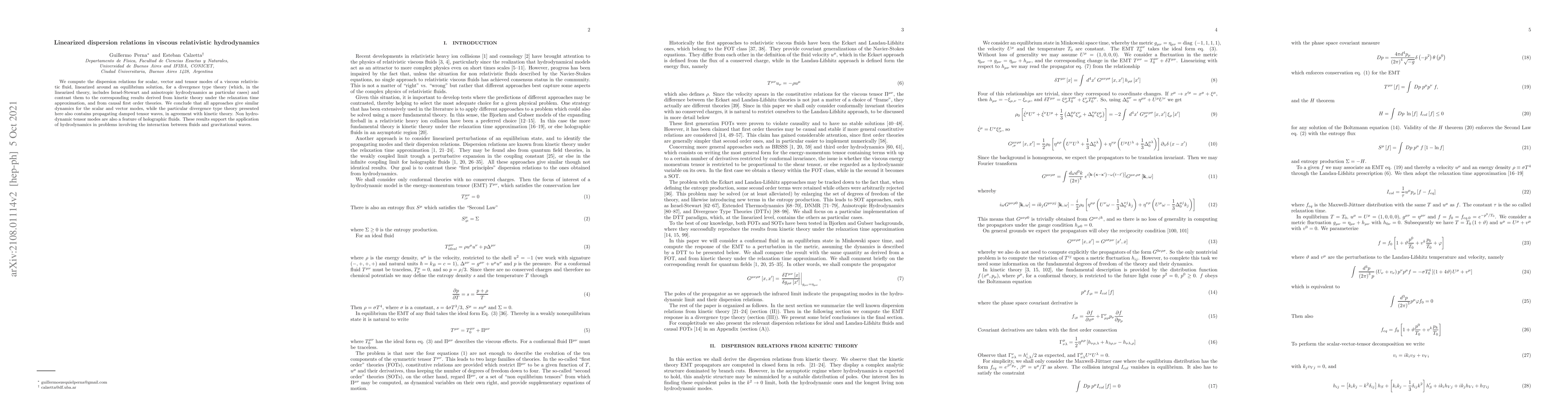 This paper computes linearized dispersion relations for viscous relativistic hydrodynamics, comparing results from divergence type theories to those from kinetic theory and causal first order theories. It finds similar dynamics for scalar and vector modes across approaches, while highlighting the presence of propagating damped tensor waves in the divergence type theory, consistent with kinetic theory.