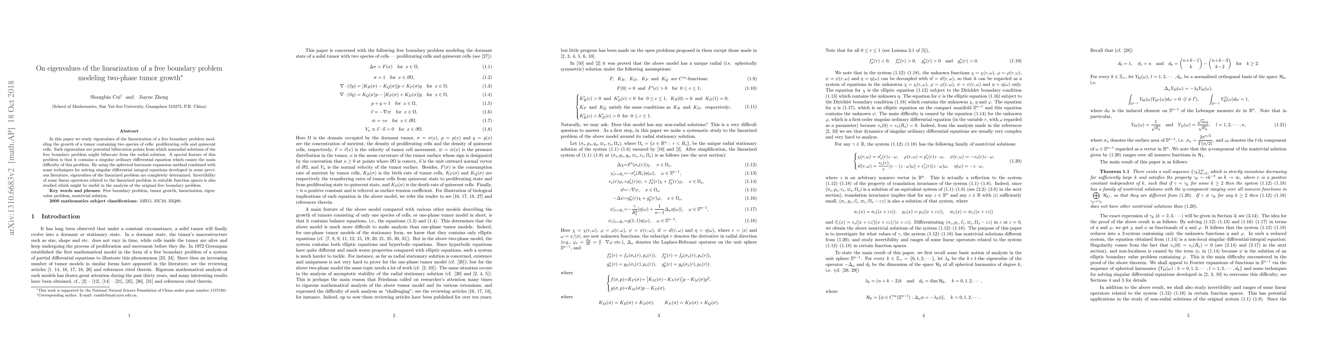 In this paper we study a linearized eigenvalue problem derived from a a free boundary problem modeling the growth of a tumor containing two species of cells: proliferating cells and quiescent cells. The reduced form of this eigenvalue problem is a $2$-system of a first-order nonlocal singular differential-integral equation in a ball coupled by a third-order elliptic pseudo-differential equation in the unit sphere. The singularity joined with non-localness of the first-order equation causes the main difficulty of this problem. By using Fourier expansion via a basis of spherical harmonic functions and some techniques for solving singular differential integral equations developed in some previous literature, we prove that there exists a null sequence $\{\gamma_k\}_{k=2}^{\infty}$ for the surface tension coefficient $\gamma$, with each of them being an eigenvalue of the linearized problem, i.e., if $\gamma=\gamma_k$ for some $k\geq 2$ then the linearized problem has extra nontrivial solutions besides the standard nontrivial solutions, and if $\gamma\neq\gamma_k$ for all $k\geq 2$ then the linearized problem does not have other nontrivial solutions than the standard nontrivial solutions. Invertibility of some linear operators related to the linearized problem in suitable function spaces is also studied.
