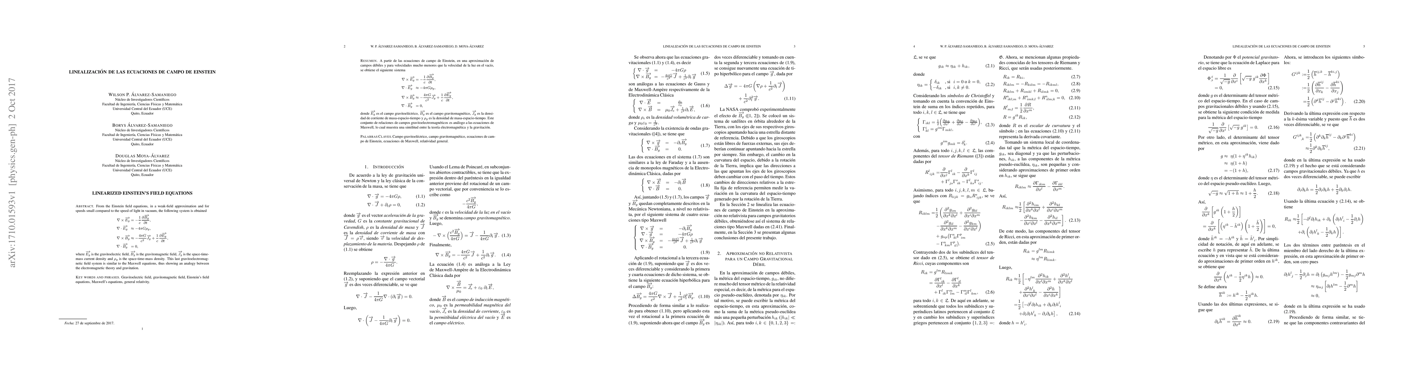 From the Einstein field equations, in a weak-field approximation and for speeds small compared to the speed of light in vacuum, the following system is obtained \begin{align*} \nabla \times \overrightarrow{E_g} & = -\frac{1}{c} \frac{\partial \overrightarrow{B_g}}{\partial t}, \nabla \cdot \overrightarrow{E_g} \;\; & \approx -4\pi G\rho_g, \nabla \times \overrightarrow{B_g} & \approx -\frac{4\pi G}{c^{2}}\overrightarrow{J_g}+ \frac{1}{c}\frac{\partial \overrightarrow{E_g}}{\partial t}, \nabla \cdot \overrightarrow{B_g} \;\; & = 0, \end{align*} where $\overrightarrow{E_g}$ is the gravitoelectric field, $\overrightarrow{B_g}$ is the gravitomagnetic field, $\overrightarrow{J_g}$ is the space-time-mass current density and $\rho_g$ is the space-time-mass density. This last gravitoelectromagnetic field system is similar to the Maxwell equations, thus showing an analogy between the electromagnetic theory and gravitation.