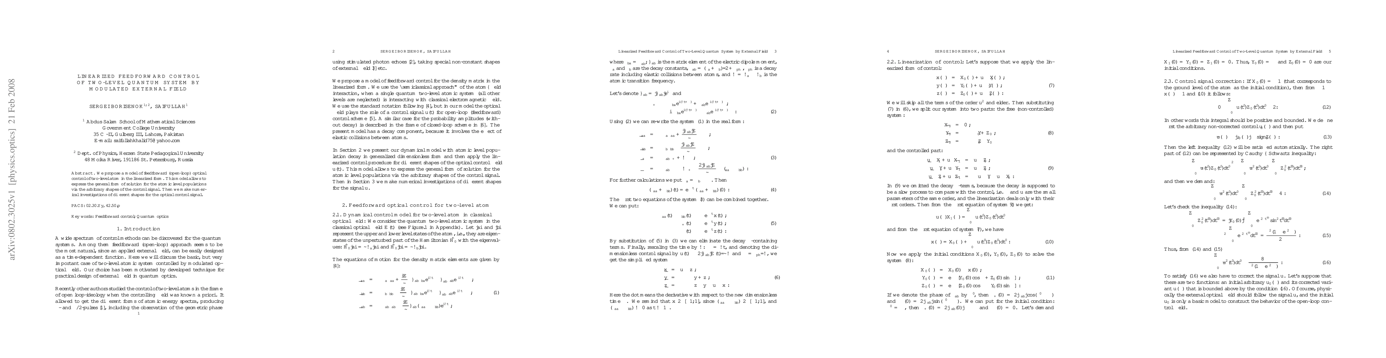Summary: This paper proposes a linearized feedforward control model for two-level quantum systems using modulated optical fields, enabling the expression of atomic population solutions via various control signal shapes, followed by numerical investigations of these shapes.