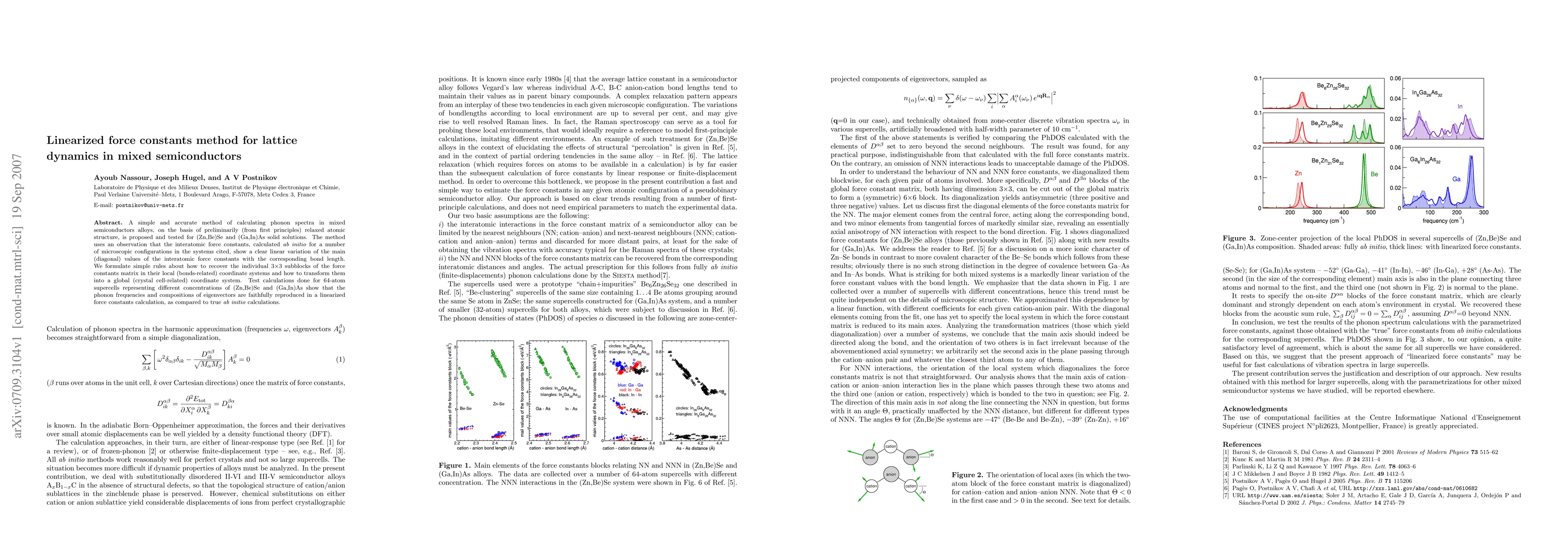 This paper proposes a linearized force constants method for calculating phonon spectra in mixed semiconductor alloys, demonstrating its accuracy through calculations on (Zn,Be)Se and (Ga,In)As. The method effectively linearizes interatomic force constants based on bond length, showing good agreement with ab initio calculations.