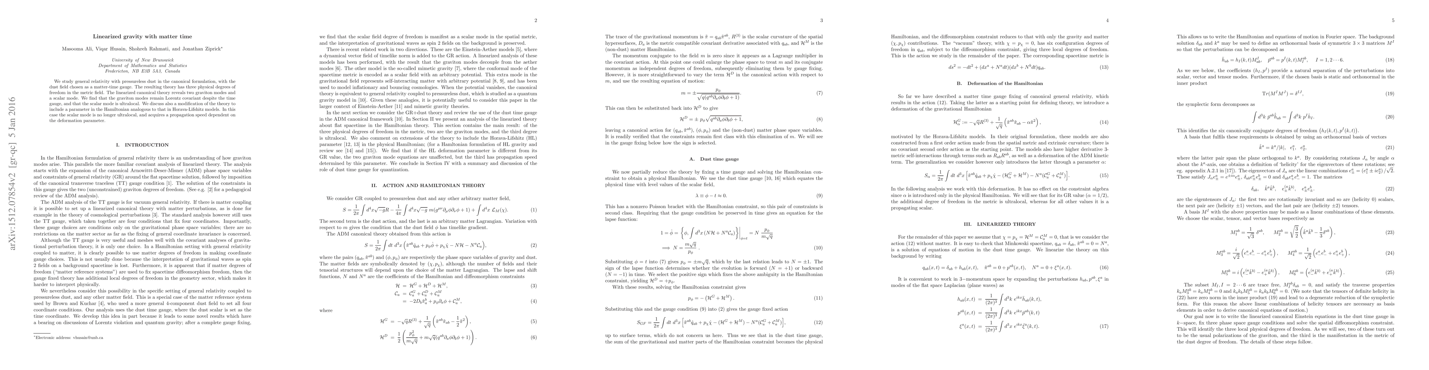 We study general relativity with pressureless dust in the canonical formulation, with the dust field chosen as a matter-time gauge. The resulting theory has three physical degrees of freedom in the metric field. The linearized canonical theory reveals two graviton modes and a scalar mode. We find that the graviton modes remain Lorentz covariant despite the time gauge, and that the scalar mode is ultralocal. We discuss also a modification of the theory to include a parameter in the Hamiltonian analogous to that in Horava-Lifshitz models. In this case the scalar mode is no longer ultralocal, and acquires a propagation speed dependent on the deformation parameter.