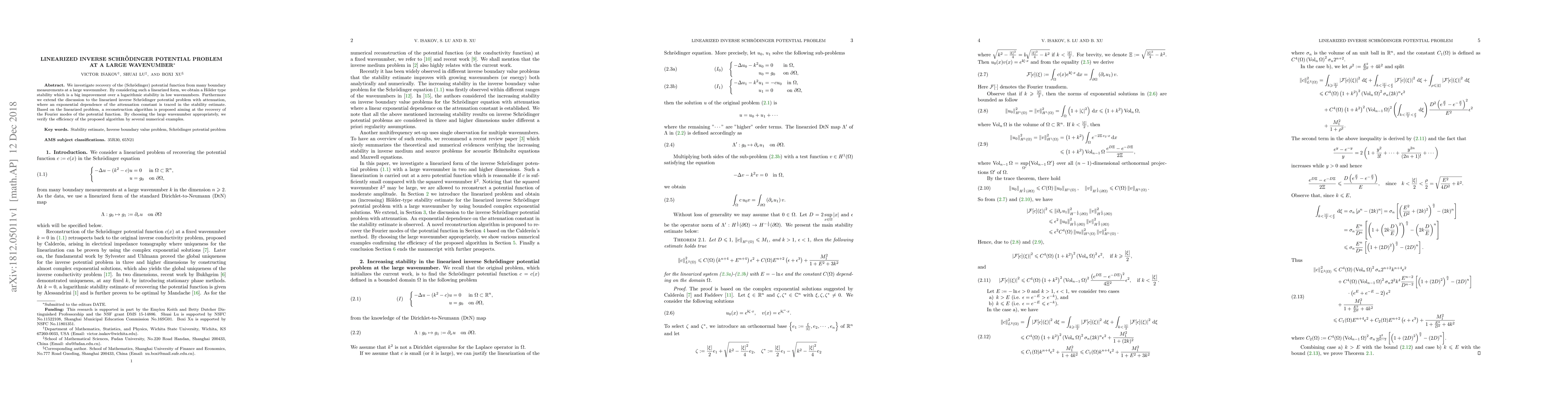 We investigate recovery of the (Schr\"odinger) potential function from many boundary measurements at a large wavenumber. By considering such a linearized form, we obtain a H\"older type stability which is a big improvement over a logarithmic stability in low wavenumbers. Furthermore we extend the discussion to the linearized inverse Schr\"odinger potential problem with attenuation, where an exponential dependence of the attenuation constant is traced in the stability estimate. Based on the linearized problem, a reconstruction algorithm is proposed aiming at the recovery of the Fourier modes of the potential function. By choosing the large wavenumber appropriately, we verify the efficiency of the proposed algorithm by several numerical examples.