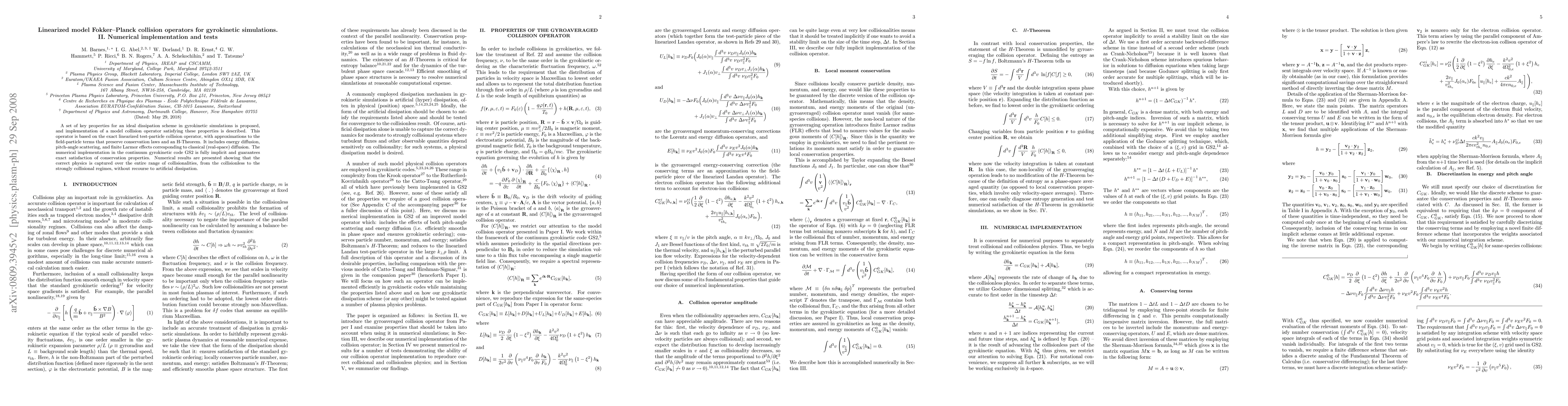 This paper proposes and implements a linearized model Fokker-Planck collision operator for gyrokinetic simulations, ensuring conservation laws and H-Theorem compliance. The numerical implementation in the GS2 code captures correct physics across collisional regimes without artificial dissipation.