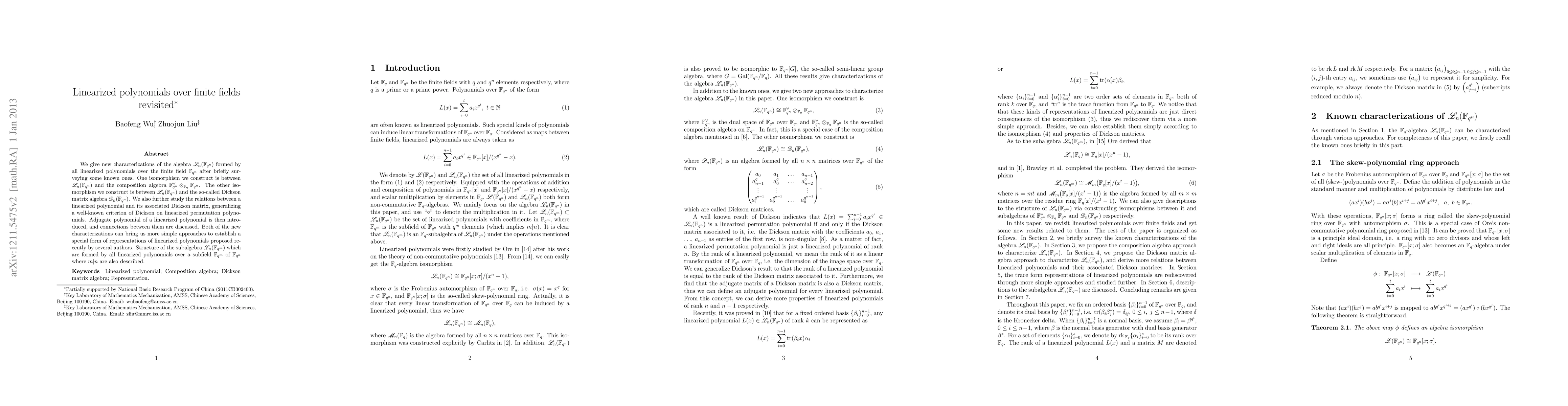 We give new characterizations of the algebra $\mathscr{L}_n(\mathbb{F}_{q^n})$ formed by all linearized polynomials over the finite field $\mathbb{F}_{q^n}$ after briefly surveying some known ones. One isomorphism we construct is between $\mathscr{L}_n(\mathbb{F}_{q^n})$ and the composition algebra $\mathbb{F}_{q^n}^\vee\otimes_{\mathbb{F}_{q}}\mathbb{F}_{q^n}$. The other isomorphism we construct is between $\mathscr{L}_n(\mathbb{F}_{q^n})$ and the so-called Dickson matrix algebra $\mathscr{D}_n(\mathbb{F}_{q^n})$. We also further study the relations between a linearized polynomial and its associated Dickson matrix, generalizing a well-known criterion of Dickson on linearized permutation polynomials. Adjugate polynomial of a linearized polynomial is then introduced, and connections between them are discussed. Both of the new characterizations can bring us more simple approaches to establish a special form of representations of linearized polynomials proposed recently by several authors. Structure of the subalgebra $\mathscr{L}_n(\mathbb{F}_{q^m})$ which are formed by all linearized polynomials over a subfield $\mathbb{F}_{q^m}$ of $\mathbb{F}_{q^n}$ where $m|n$ are also described.