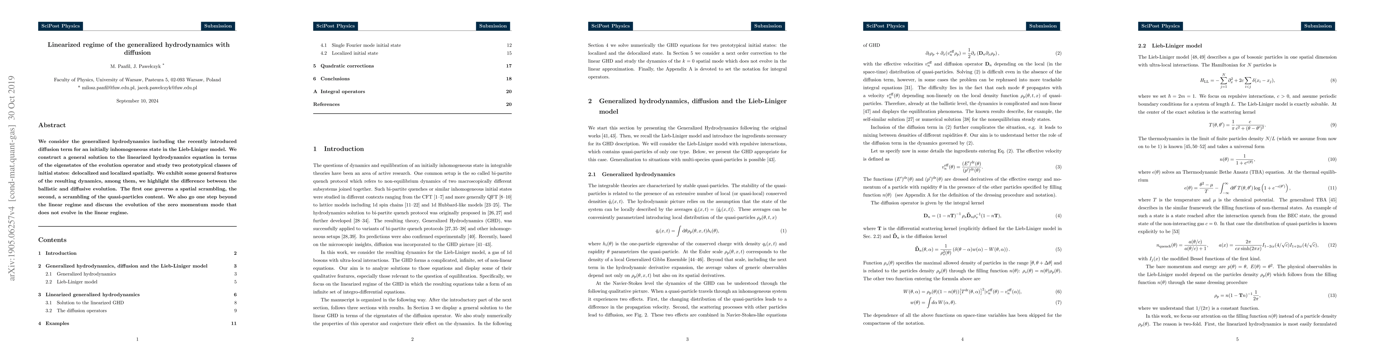 This paper explores the generalized hydrodynamics in the Lieb-Liniger model, incorporating a diffusion term for inhomogeneous states. It provides a solution to the linearized hydrodynamics equation and examines the dynamics of delocalized and localized initial states, highlighting the difference between ballistic and diffusive evolution, and briefly discusses the evolution of the zero momentum mode beyond linear regime.